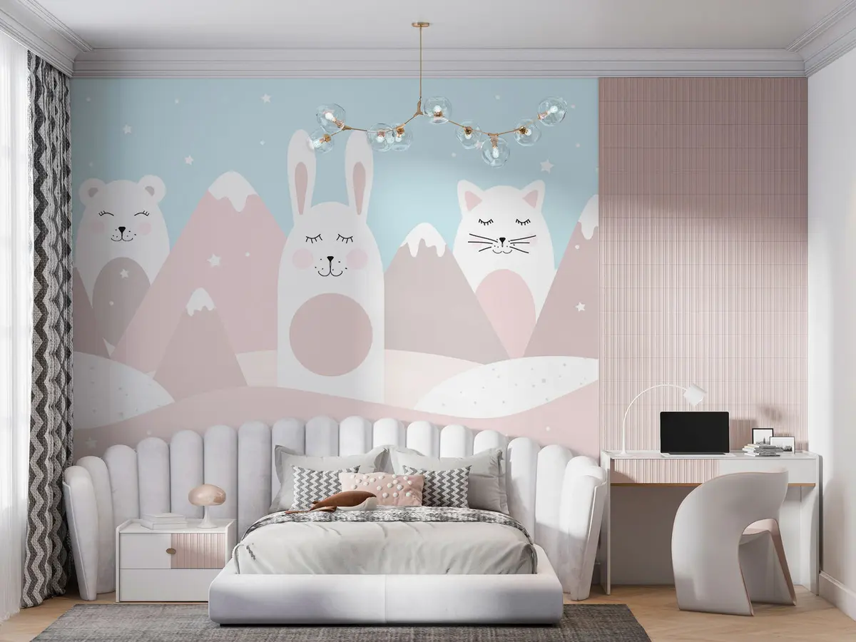 Fototapety Zajac, medveď, líška na pozadí béžových zasnežených hôr Nr. u98135