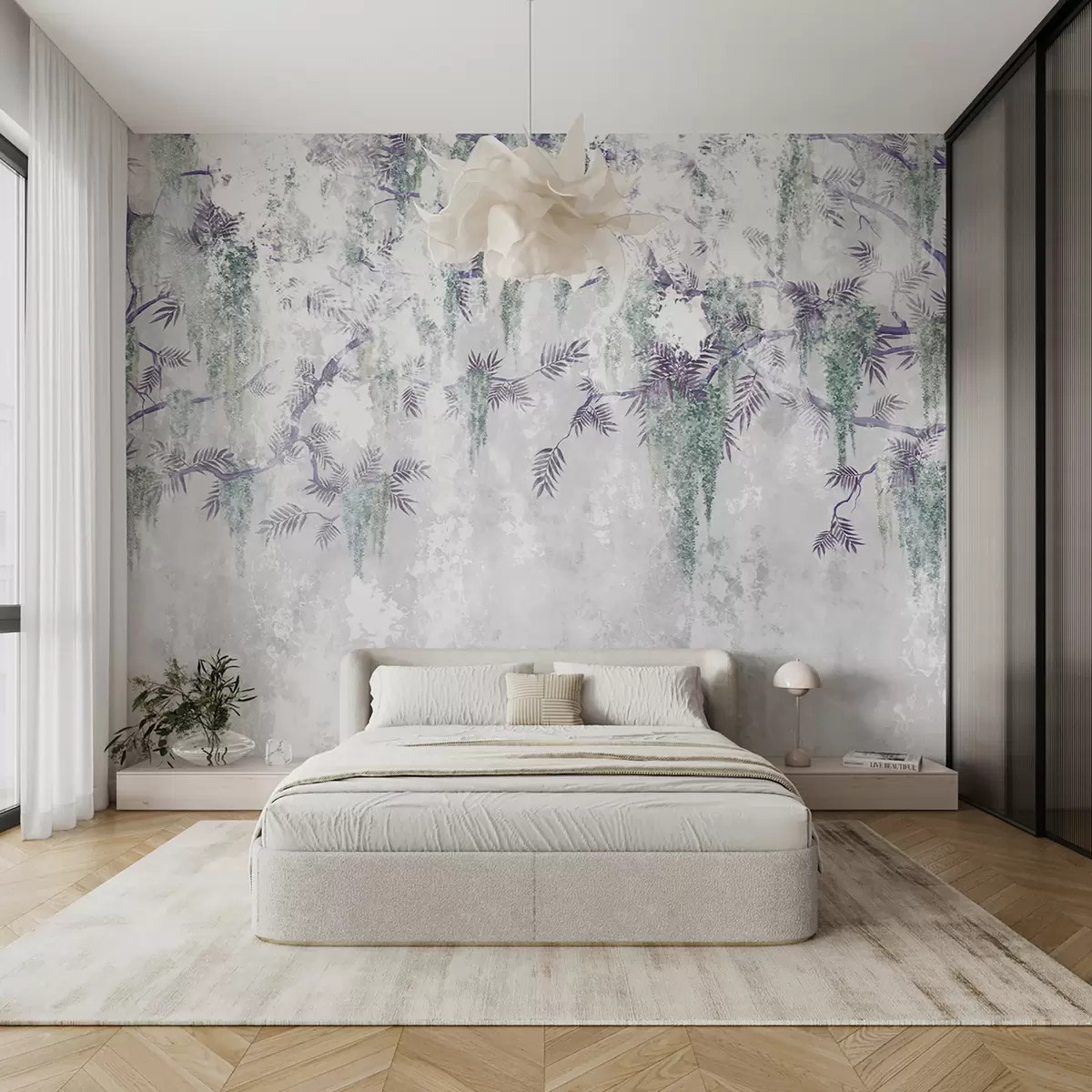 Fototapety Závesné módne chrbtové vetvy s fialovými kvetmi v modrých farbách Nr. u73816v1