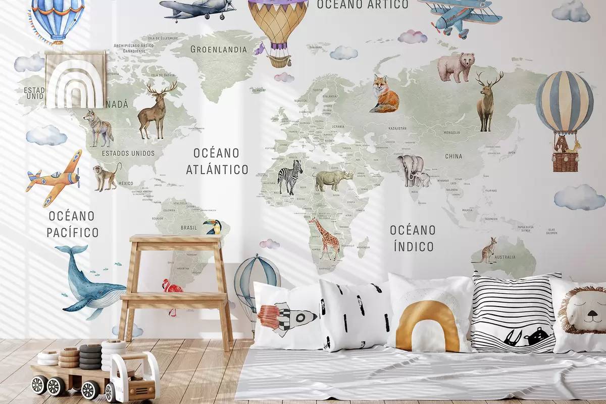 Fototapety Detská mapa v akvarelovom štýle so zvieratkami a teplovzdušnými balónmi. Španielsky jazyk. Zelená farba. Nr. c00001es