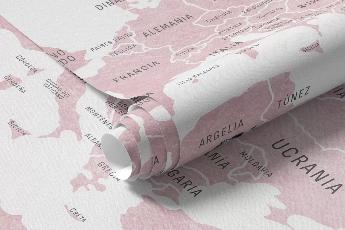 Fototapety Detská mapa v akvarelovom štýle so zvieratkami a teplovzdušnými balónmi. Španielsky jazyk. Ružová farba. Nr. c00001esv3