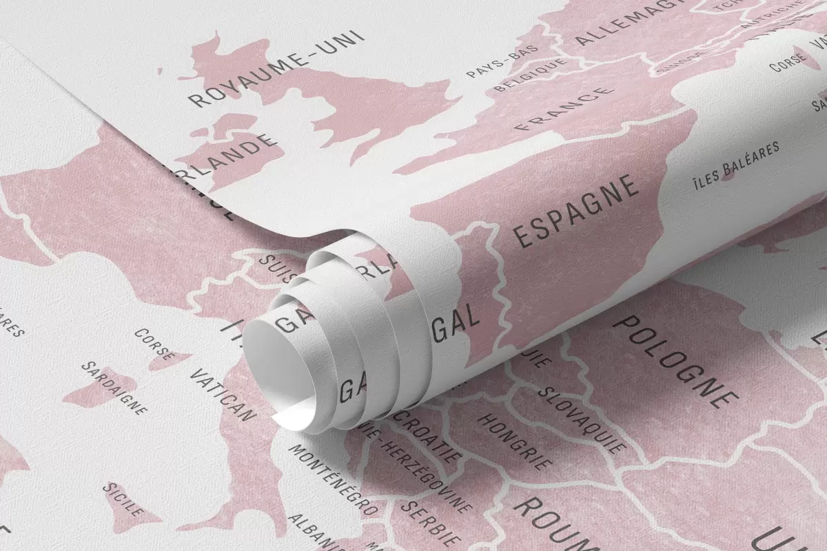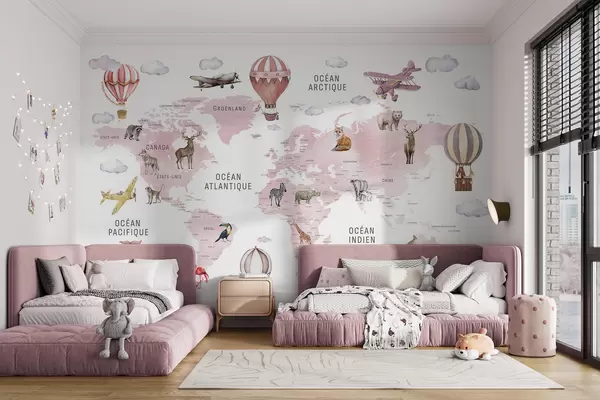 Fototapety Detská mapa v akvarelovom štýle so zvieratkami a teplovzdušnými balónmi. Francúzsky jazyk. Ružová farba. Nr. c00001frv3