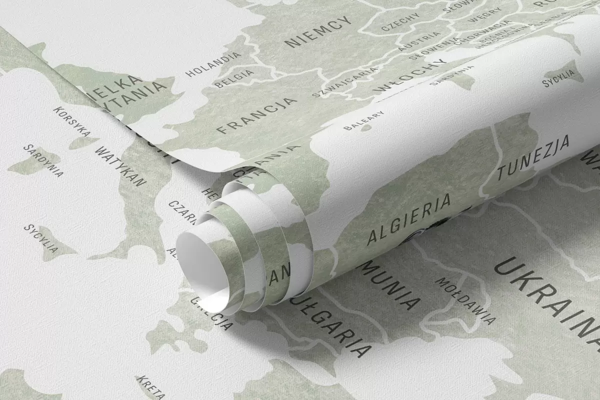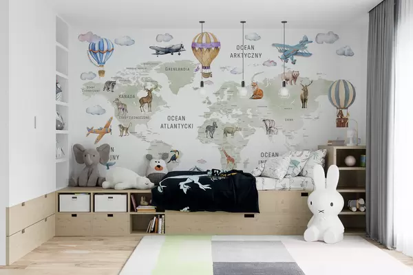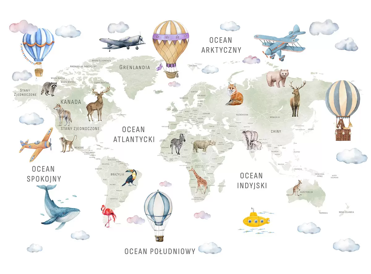 Fototapety Detská mapa v akvarelovom štýle so zvieratkami a teplovzdušnými balónmi. Poľský jazyk. Zelená farba. Nr. c00001pl