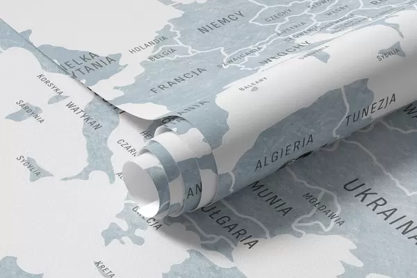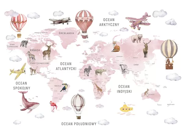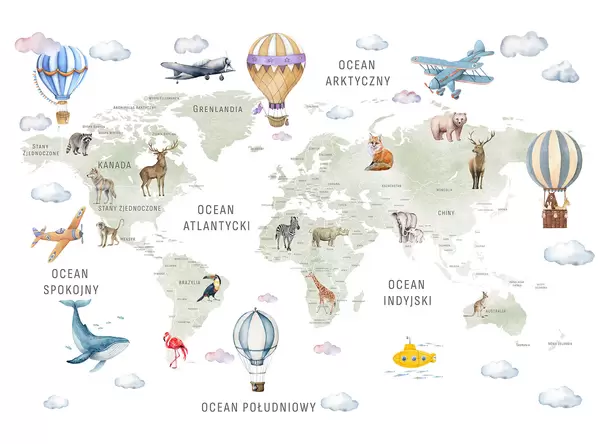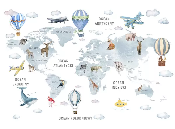 Fototapety Detská mapa v akvarelovom štýle so zvieratkami a teplovzdušnými balónmi. Poľský jazyk. Modrá farba. Nr. c00001plv1