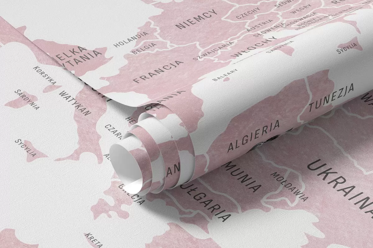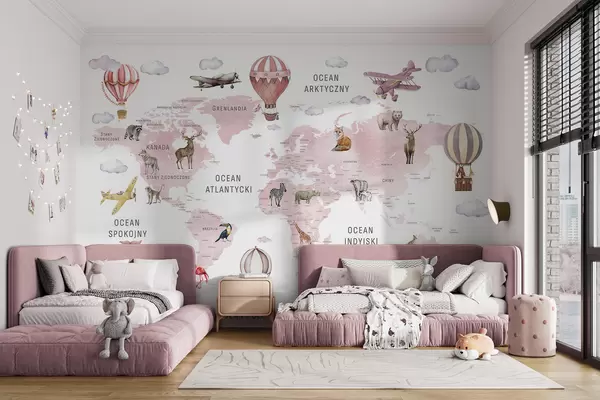 Fototapety Detská mapa v akvarelovom štýle so zvieratkami a teplovzdušnými balónmi. Poľský jazyk. Ružová farba. Nr. c00001plv3
