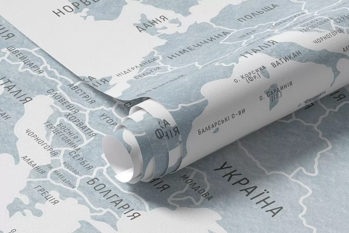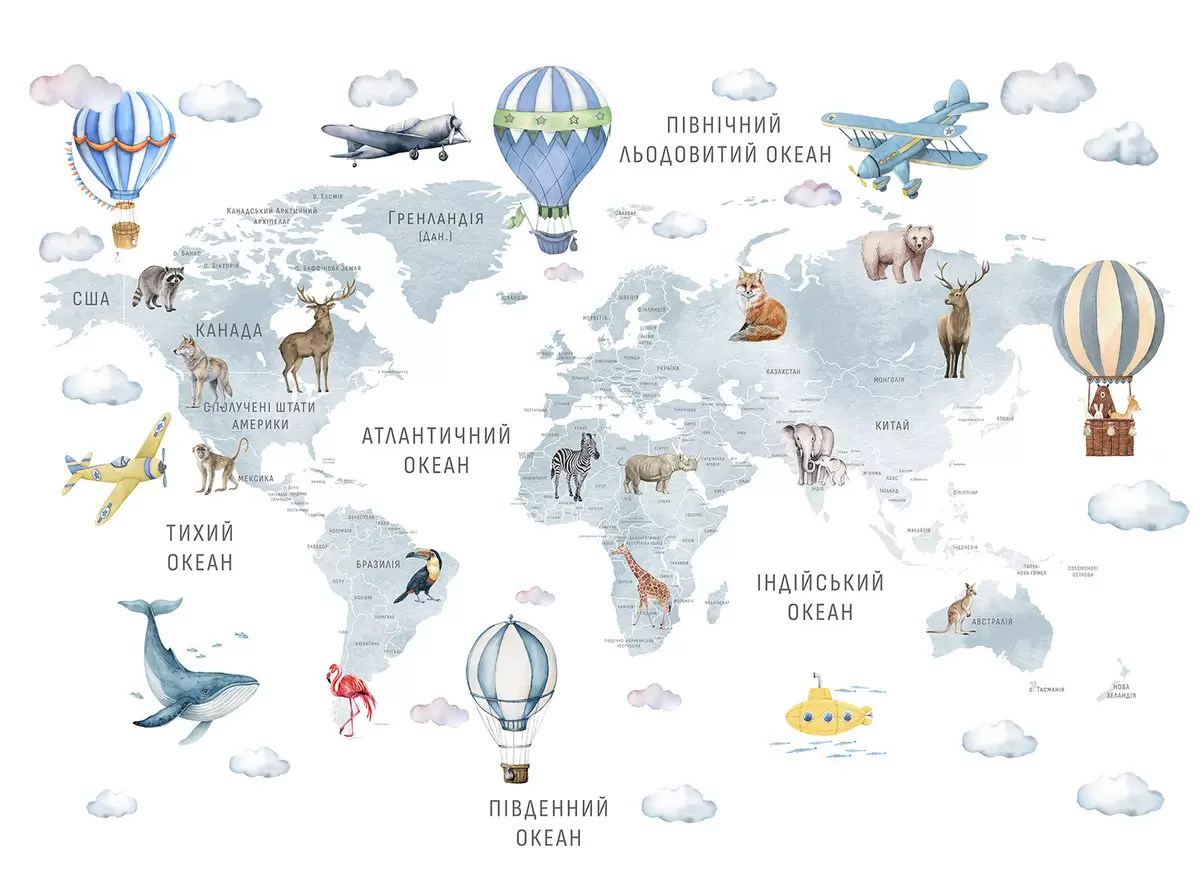 Fototapety Detská mapa v akvarelovom štýle so zvieratkami a teplovzdušnými balónmi. Ukrajinský jazyk. Modrá farba. Nr. c00001ukv1