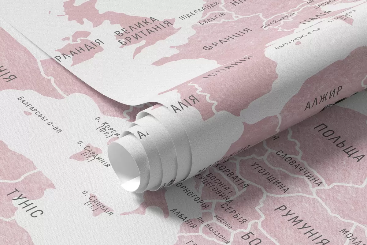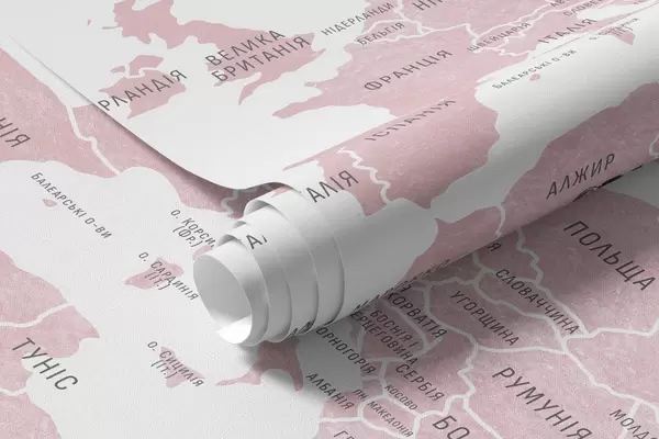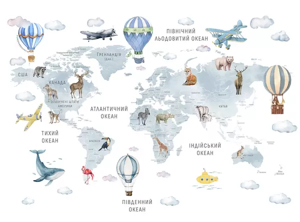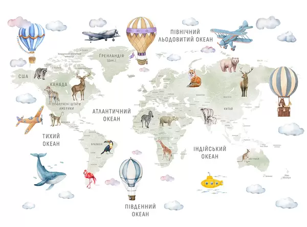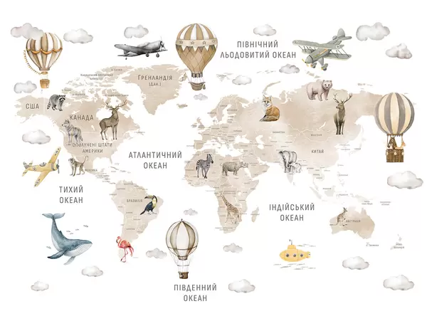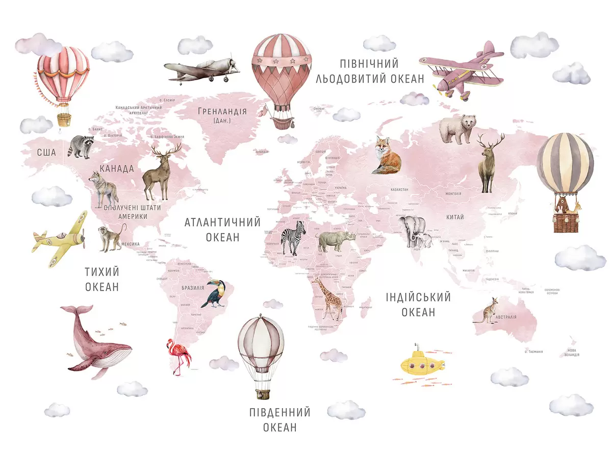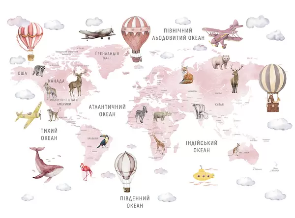 Fototapety Detská mapa v akvarelovom štýle so zvieratkami a teplovzdušnými balónmi. Ukrajinský jazyk. Ružová farba. Nr. c00001ukv3