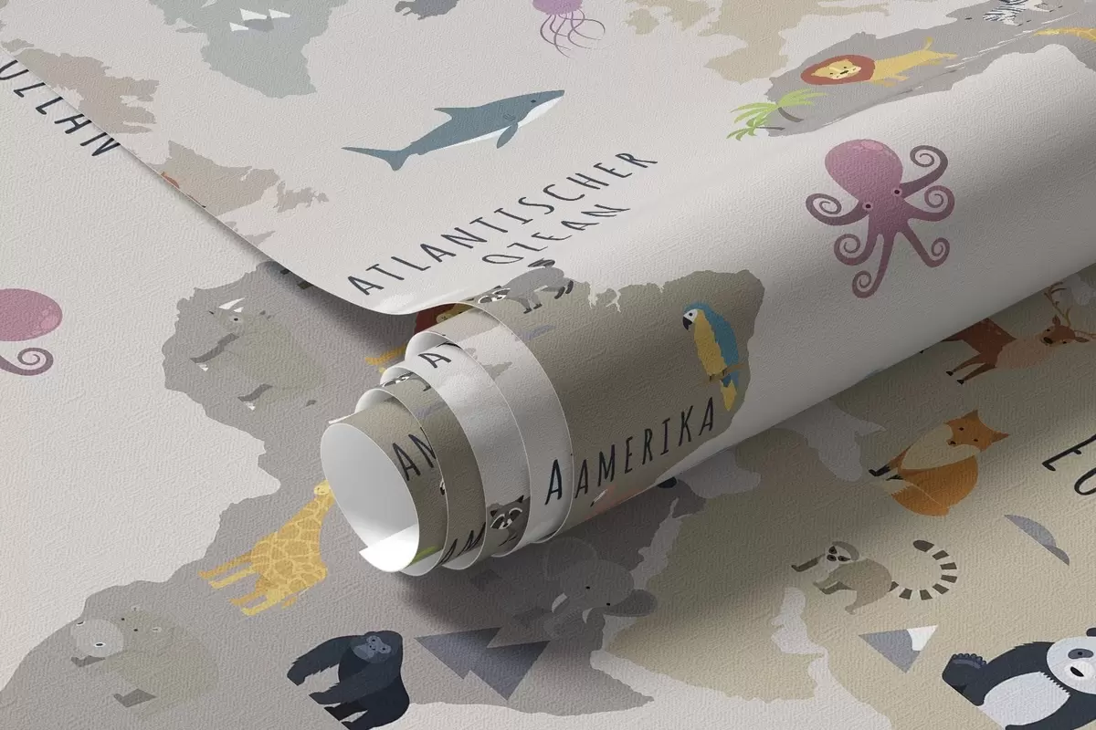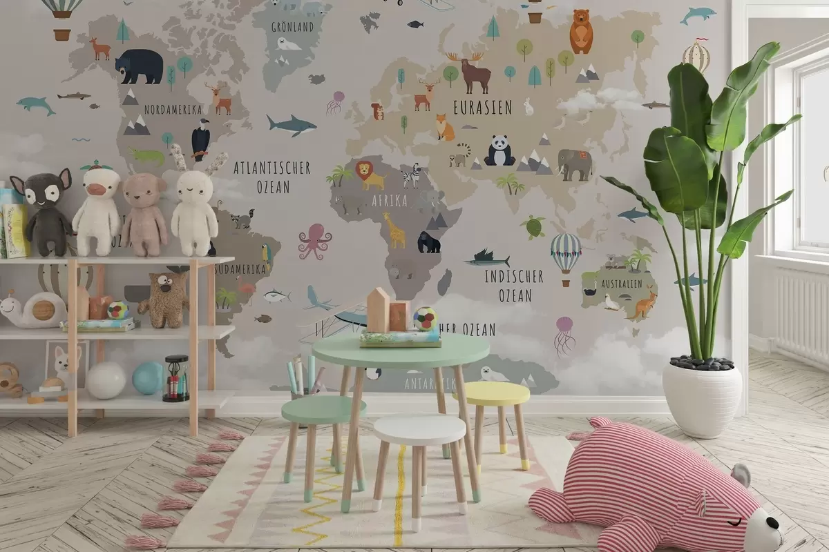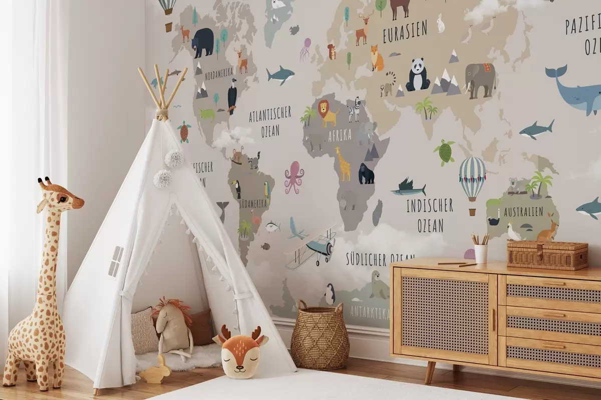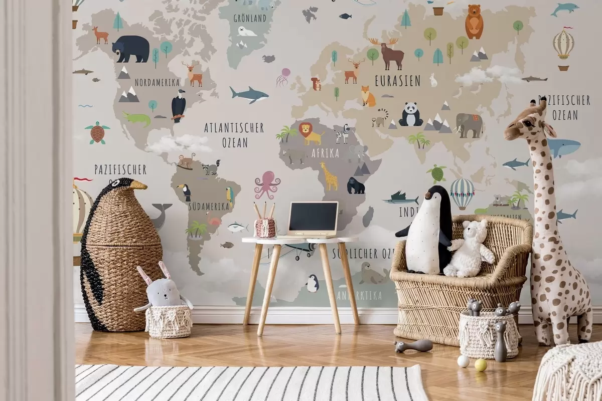 Fototapety Detská mapa sveta so zvieratami a teplovzdušnými balónmi. Nemecký jazyk Nr. c00002de