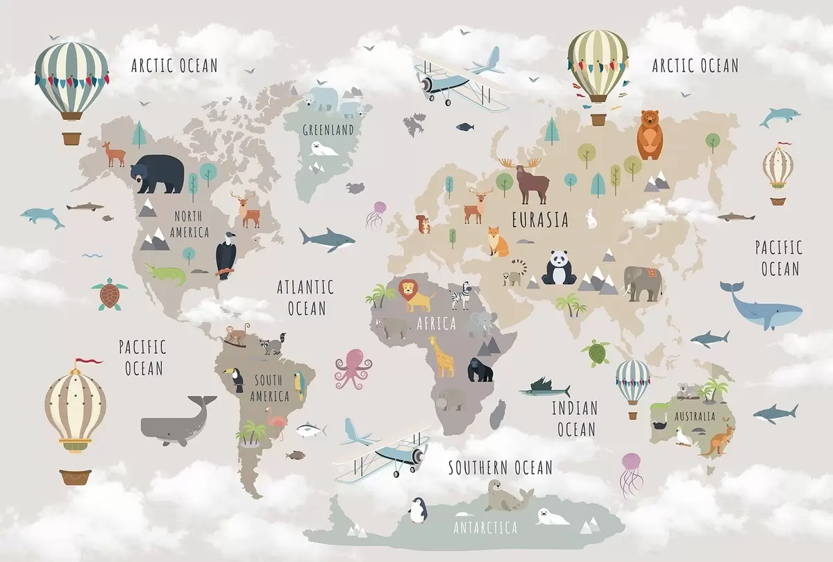Fototapety Detská mapa sveta so zvieratami a teplovzdušnými balónmi. Anglický jazyk Nr. c00002en