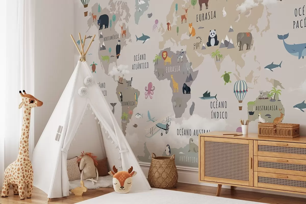 Fototapety Detská mapa sveta so zvieratami a teplovzdušnými balónmi. Španielsky jazyk Nr. c00002es