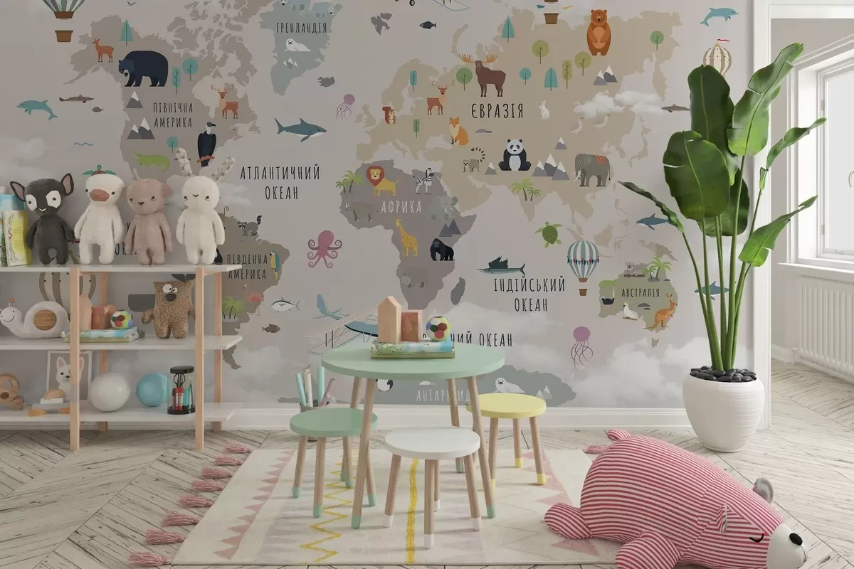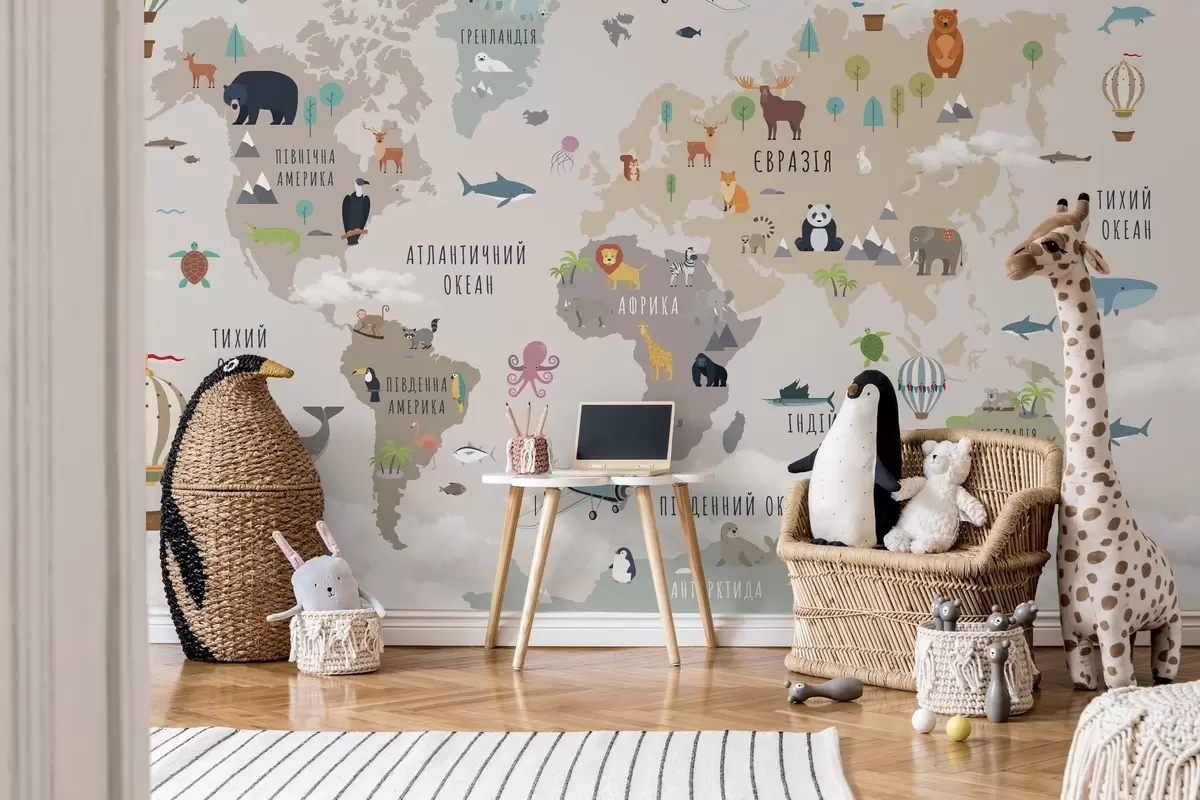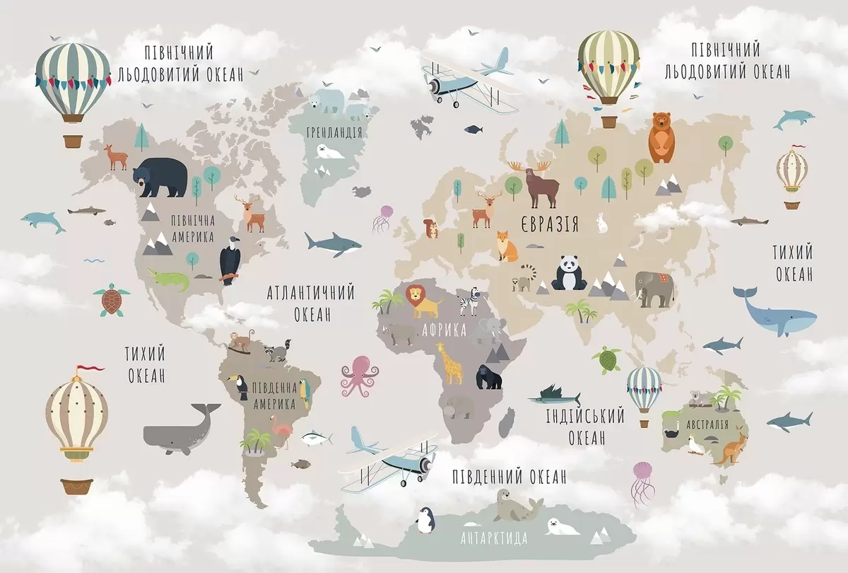 Fototapety Detská mapa sveta so zvieratami a teplovzdušnými balónmi. Ukrajinský jazyk Nr. c00002uk