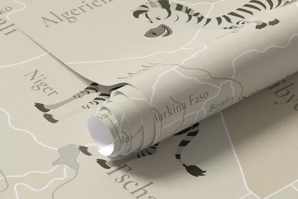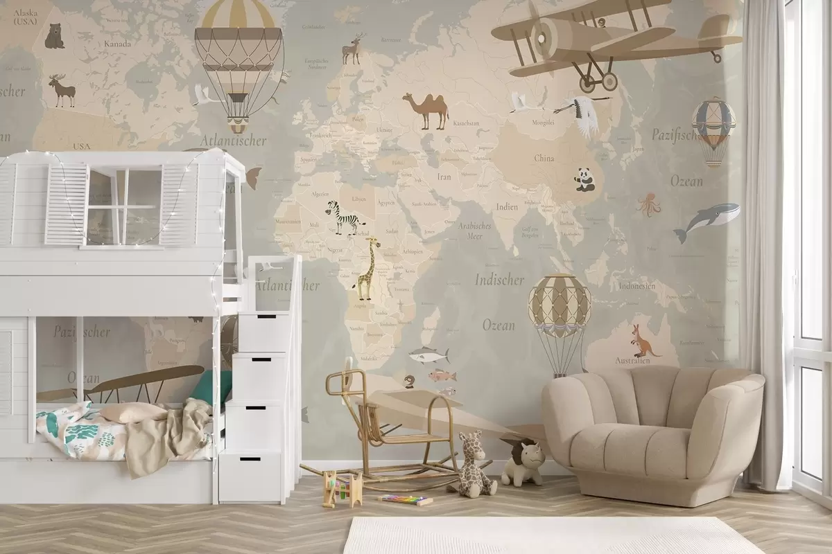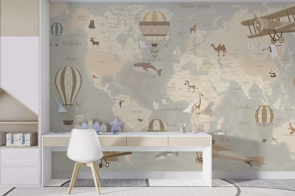 Fototapety Detská mapa sveta so zvieratami, lietadlami a teplovzdušnými balónmi. Nemecký jazyk. Béžová farba Nr. c00003de
