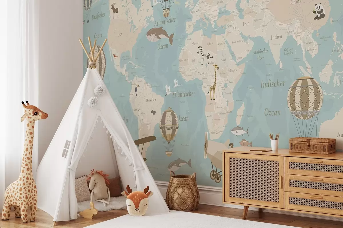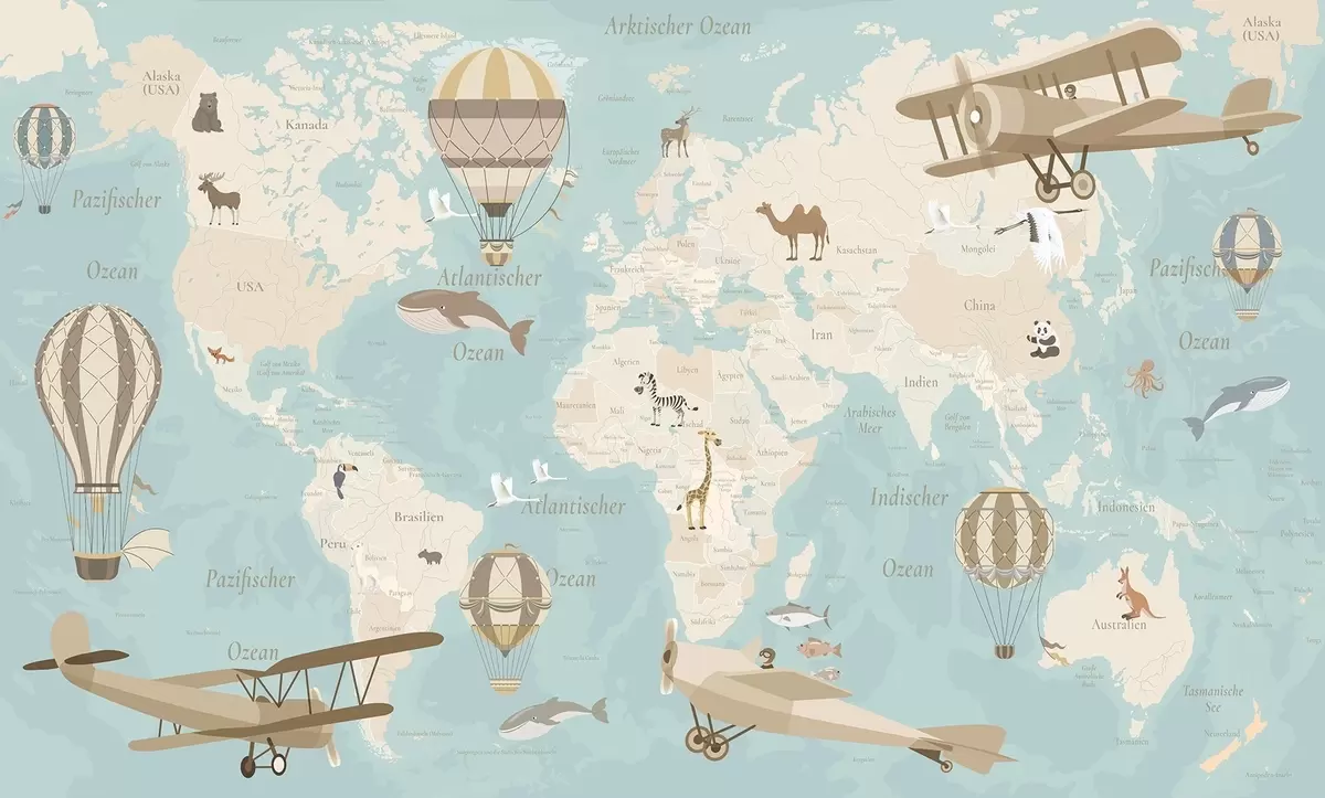 Fototapety Detská mapa sveta so zvieratami, lietadlami a teplovzdušnými balónmi. Nemecký jazyk. Modrá farba. Nr. c00003dev1