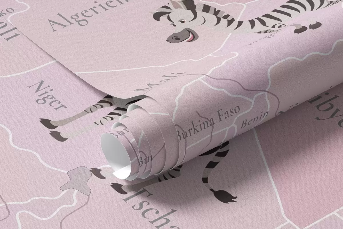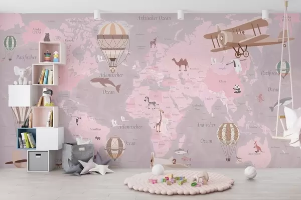 Fototapety Detská mapa sveta so zvieratami, lietadlami a teplovzdušnými balónmi. Nemecký jazyk. Ružová farba. Nr. c00003dev3