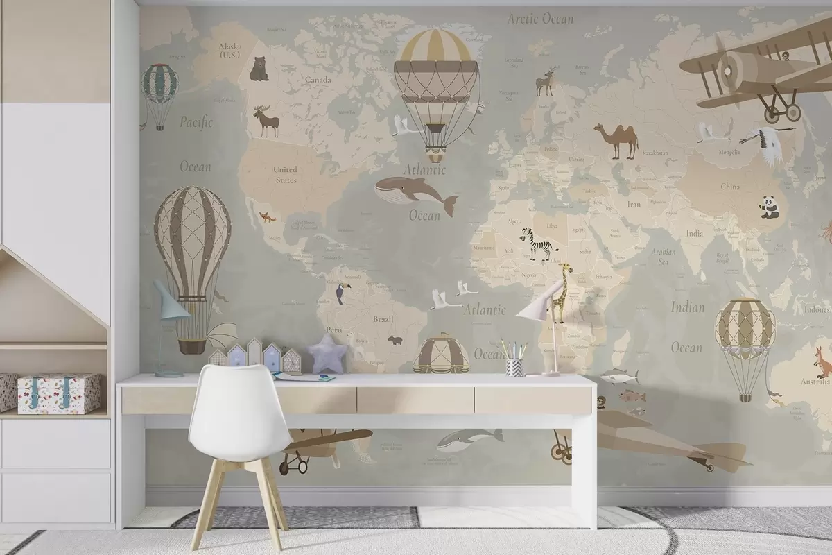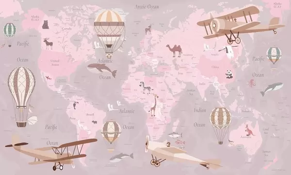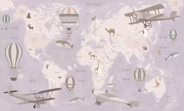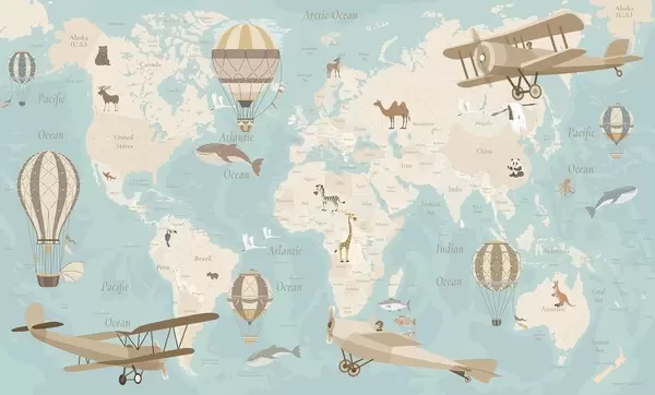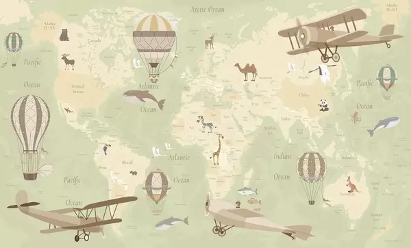 Fototapety Detská mapa sveta so zvieratami, lietadlami a teplovzdušnými balónmi. V anglickom jazyku. Béžová farba. Nr. c00003en