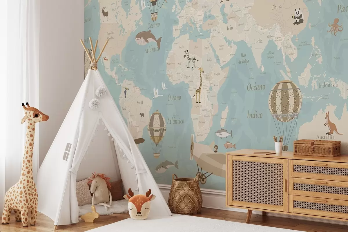 Fototapety Detská mapa sveta so zvieratami, lietadlami a teplovzdušnými balónmi. Španielsky jazyk. Modrá farba. Nr. c00003esv1