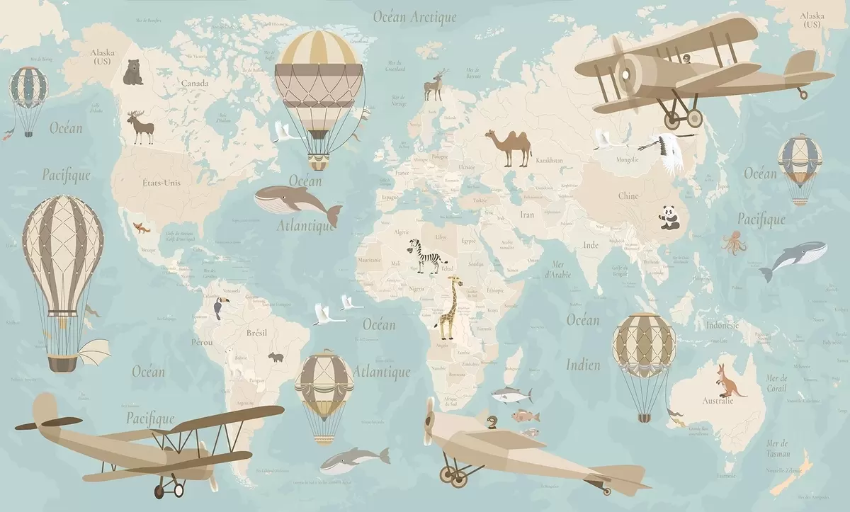 Fototapety Detská mapa sveta so zvieratami, lietadlami a teplovzdušnými balónmi. Francúzsky jazyk. Modrá farba. Nr. c00003frv1