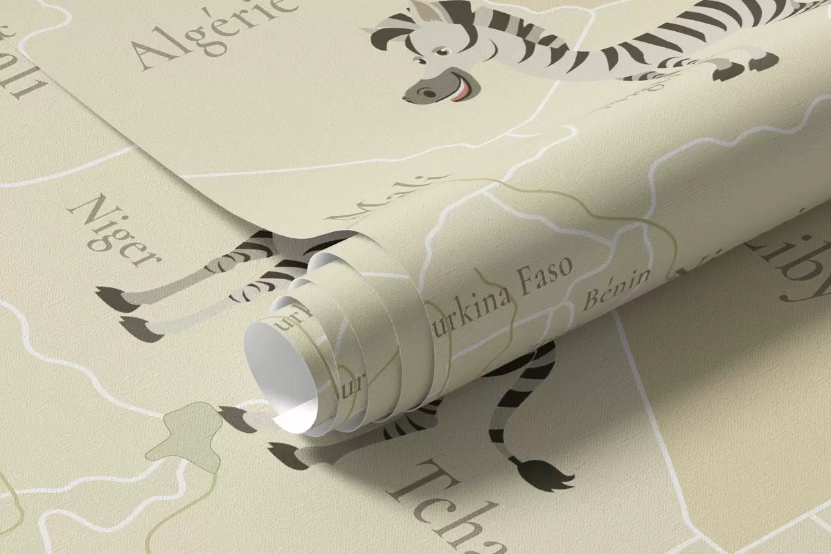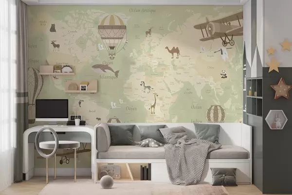 Fototapety Detská mapa sveta so zvieratami, lietadlami a teplovzdušnými balónmi. Francúzsky jazyk. Zelená farba. Nr. c00003frv2