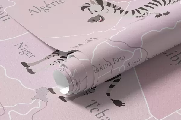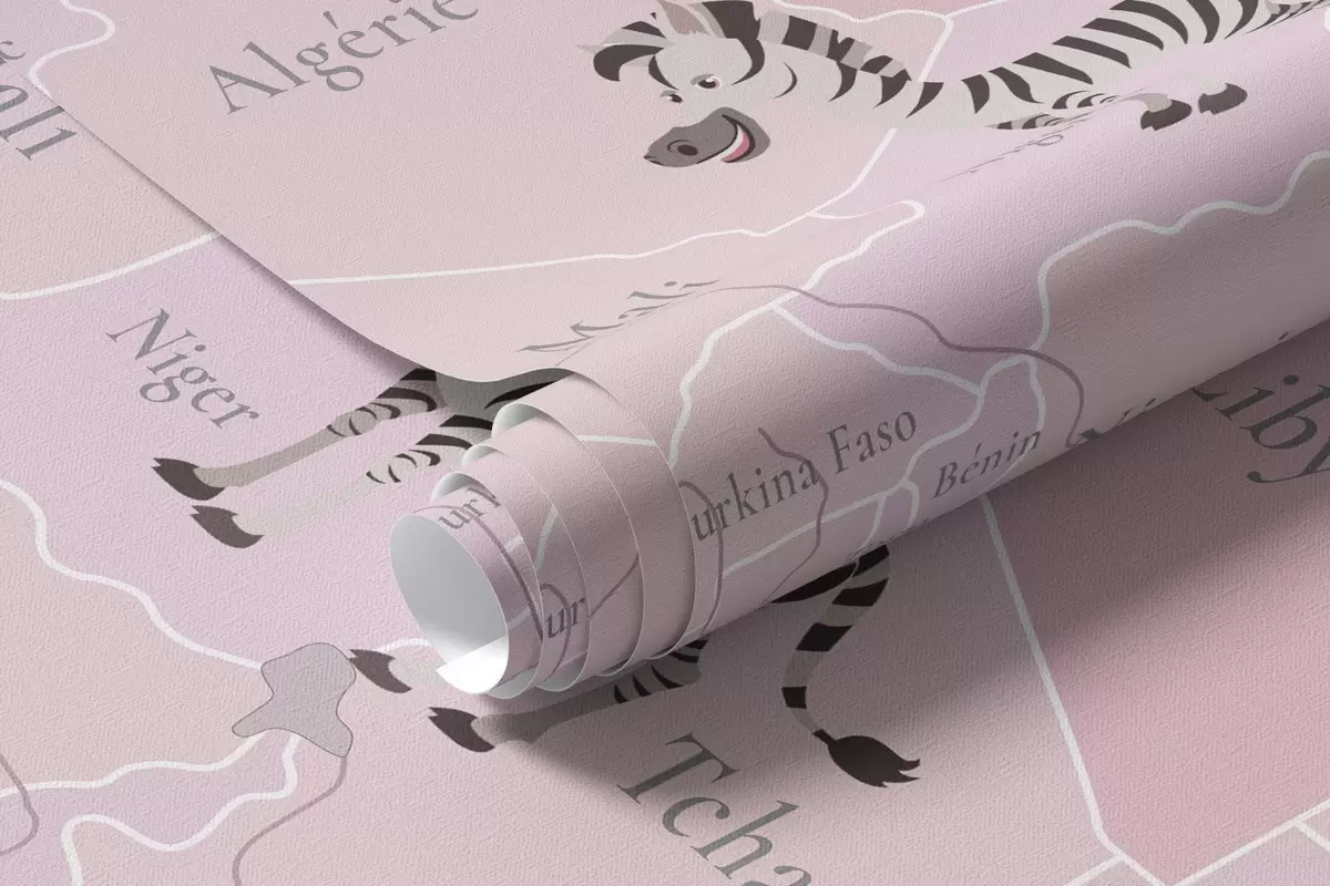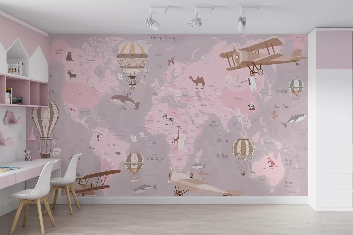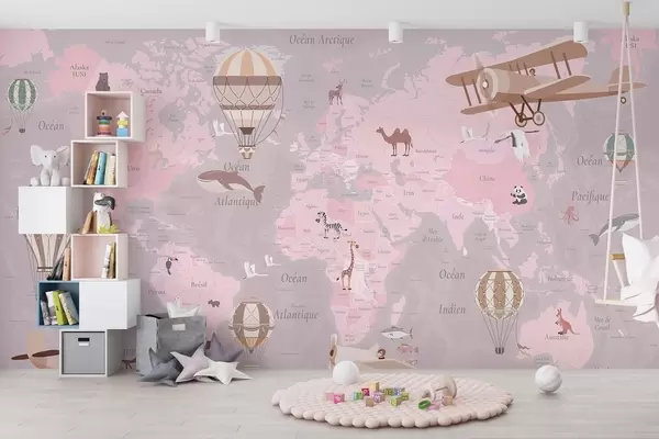 Fototapety Detská mapa sveta so zvieratami, lietadlami a teplovzdušnými balónmi. Francúzsky jazyk. Ružová farba. Nr. c00003frv3