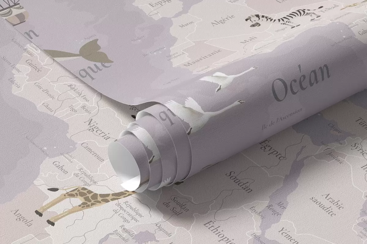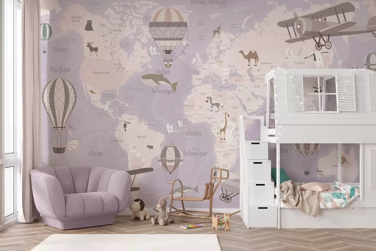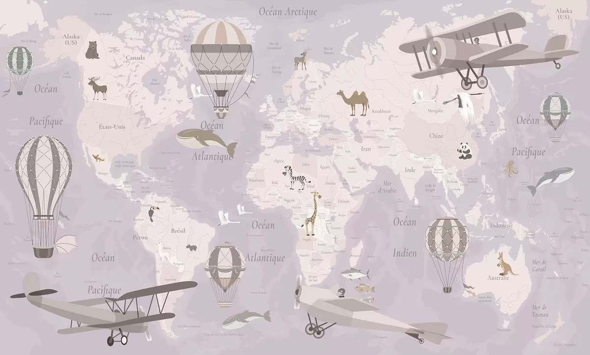 Fototapety Detská mapa sveta so zvieratami, lietadlami a teplovzdušnými balónmi. Francúzsky jazyk. Fialová farba. Nr. c00003frv4