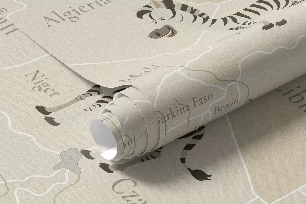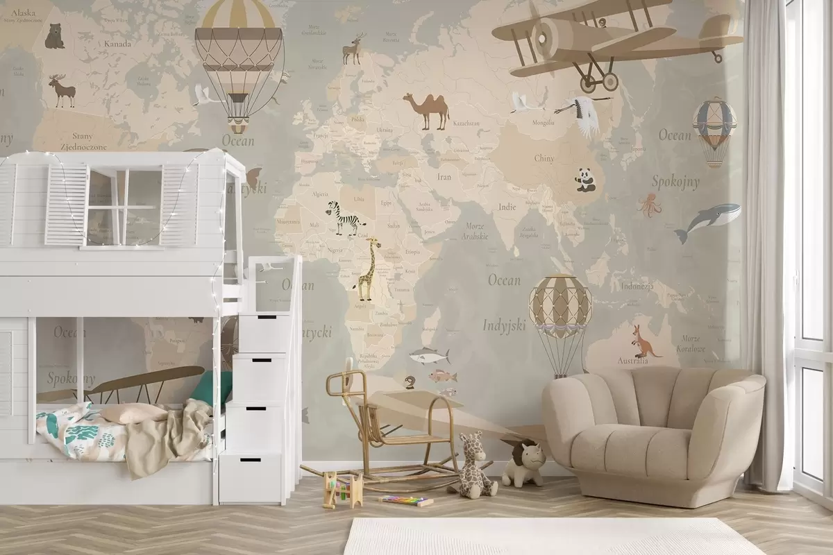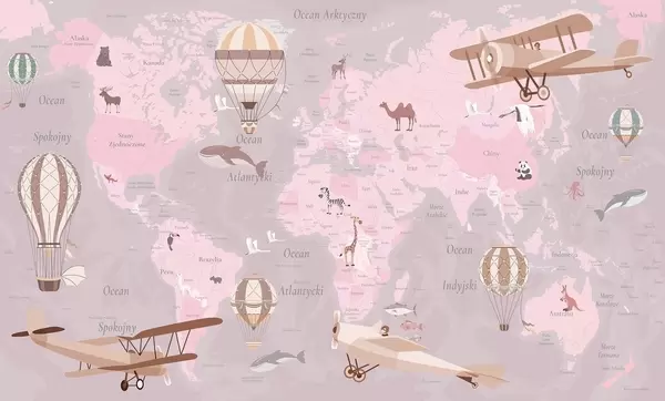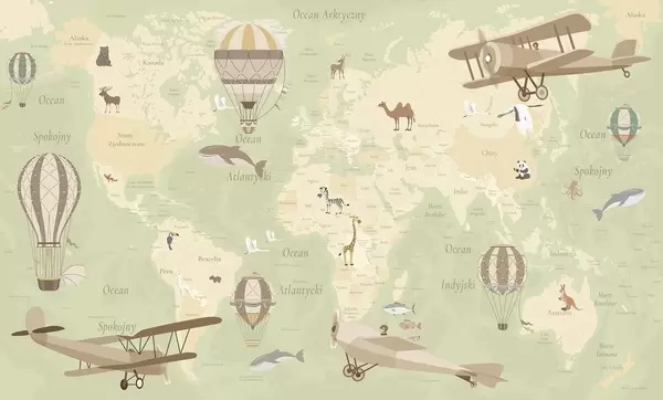 Fototapety Detská mapa sveta so zvieratami, lietadlami a teplovzdušnými balónmi. Poľský jazyk. Béžová farba. Nr. c00003pl