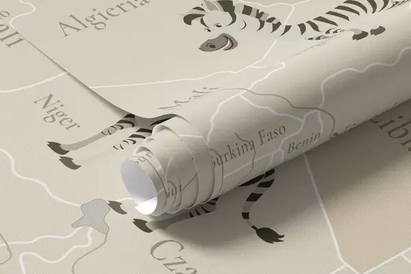 Fototapety Detská mapa sveta so zvieratami, lietadlami a teplovzdušnými balónmi. Poľský jazyk. Béžová farba Nr. c00003pl