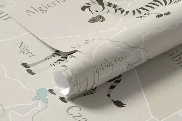 Fototapety Detská mapa sveta so zvieratami, lietadlami a teplovzdušnými balónmi. Poľský jazyk. Modrá farba. Nr. c00003plv1