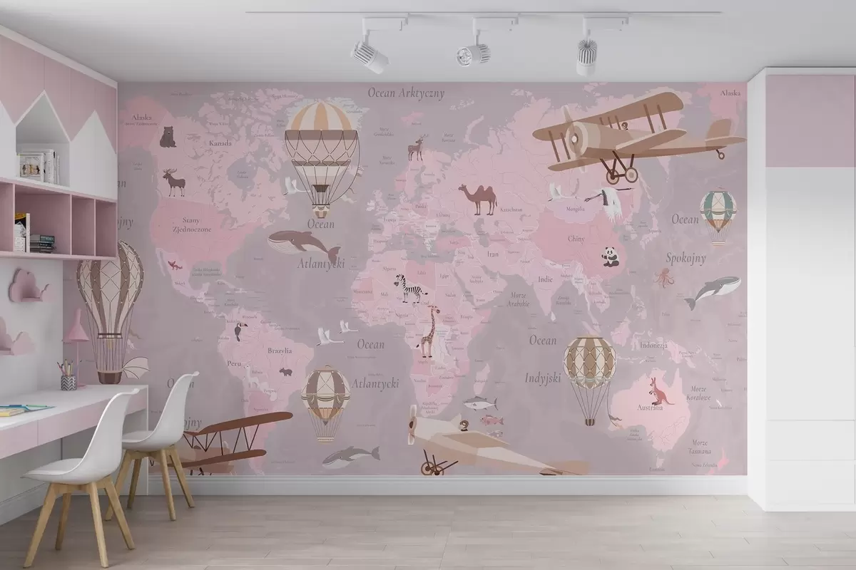 Fototapety Detská mapa sveta so zvieratami, lietadlami a teplovzdušnými balónmi. Poľský jazyk. Ružová farba. Nr. c00003plv3