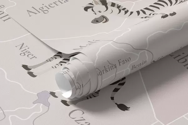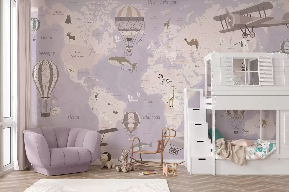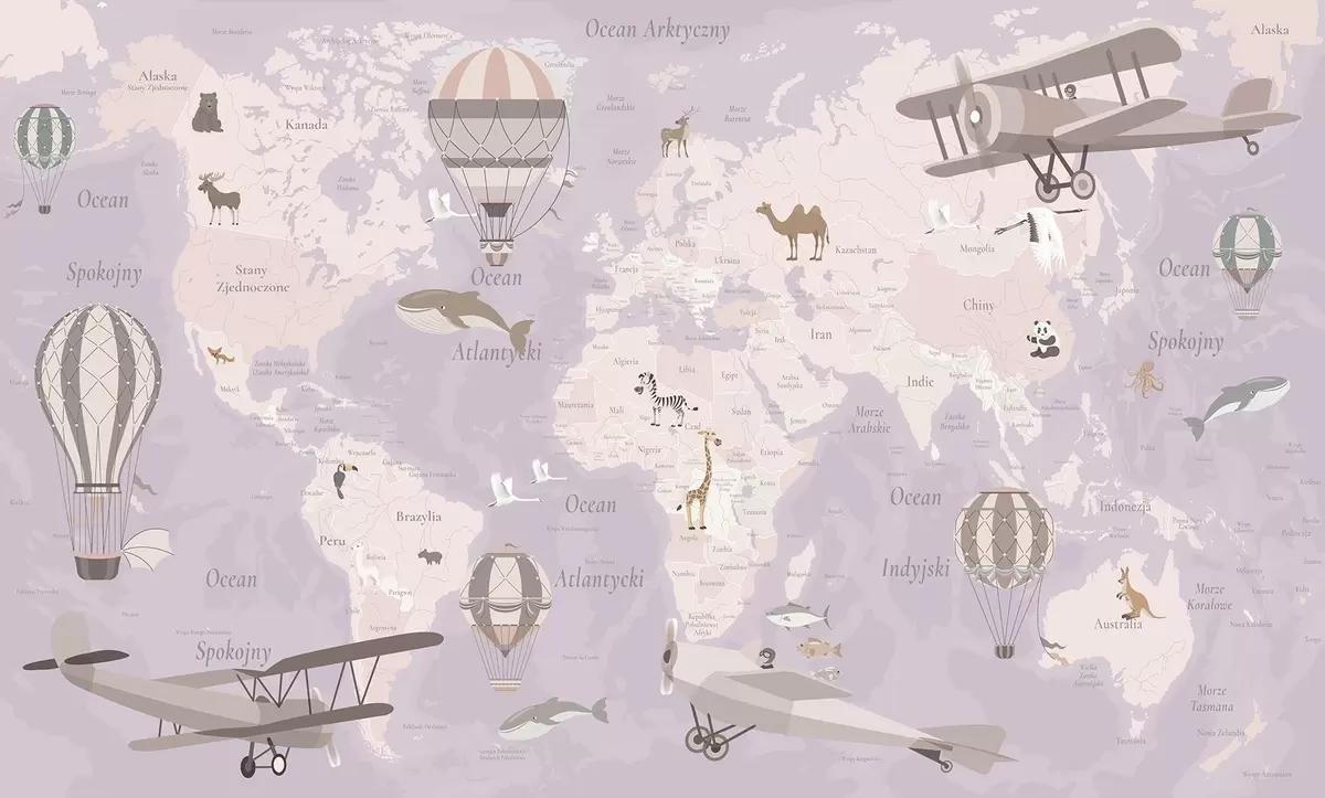 Fototapety Detská mapa sveta so zvieratami, lietadlami a teplovzdušnými balónmi. Poľský jazyk. Fialová farba. Nr. c00003plv4