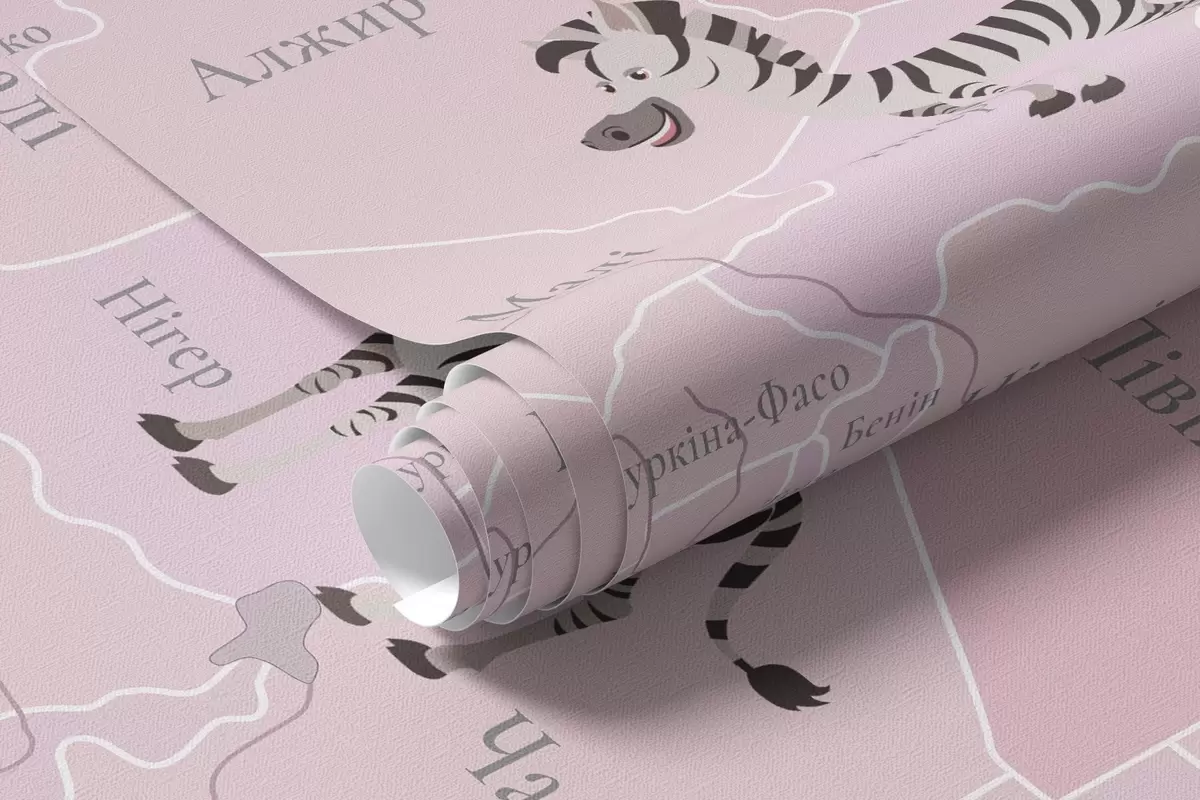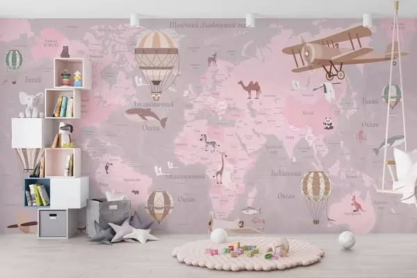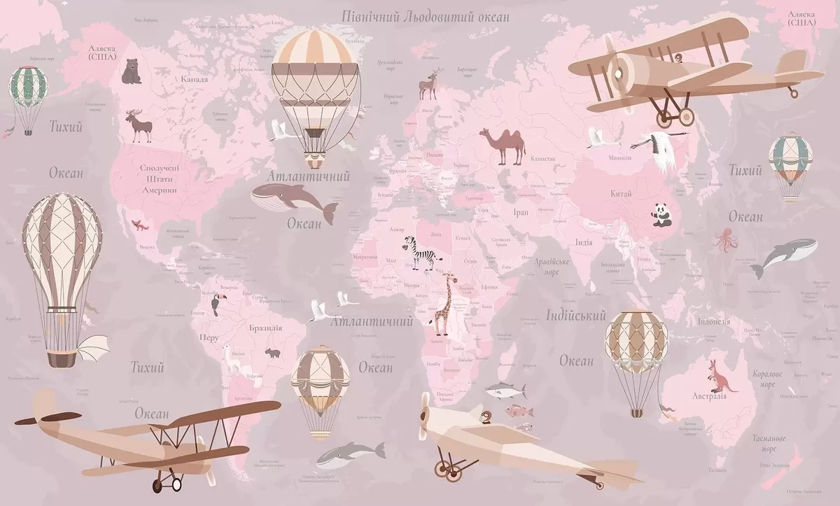 Fototapety Detská mapa sveta so zvieratami, lietadlami a teplovzdušnými balónmi. Ukrajinský jazyk. Ružová farba Nr. c00003ukv3