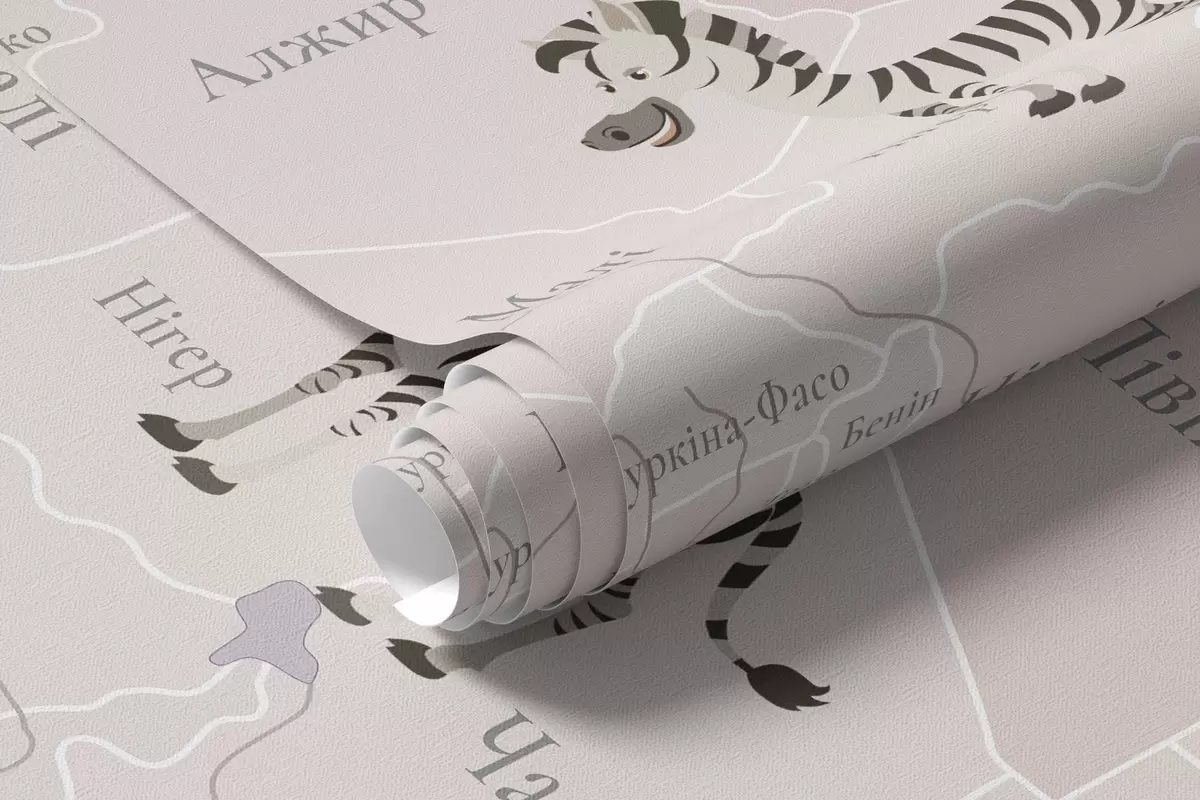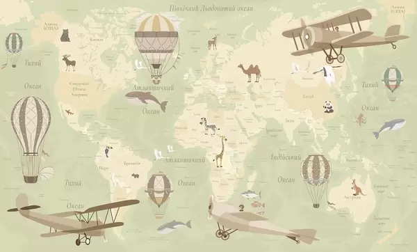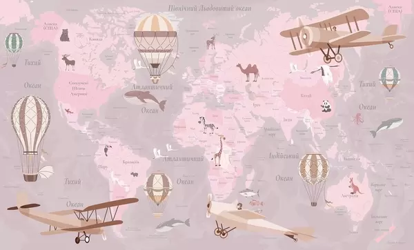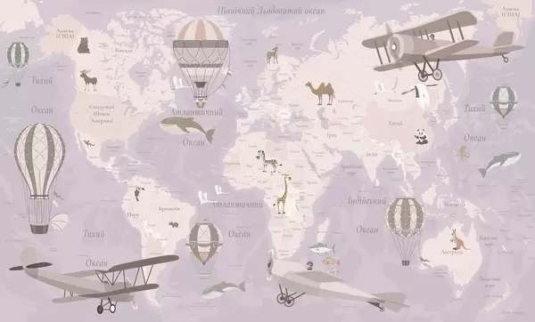 Fototapety Detská mapa sveta so zvieratami, lietadlami a teplovzdušnými balónmi. Ukrajinský jazyk. Fialová farba Nr. c00003ukv4