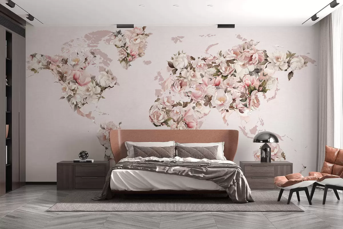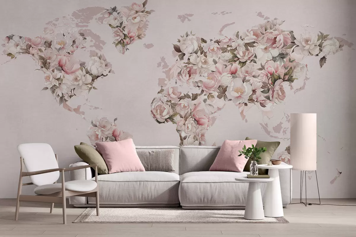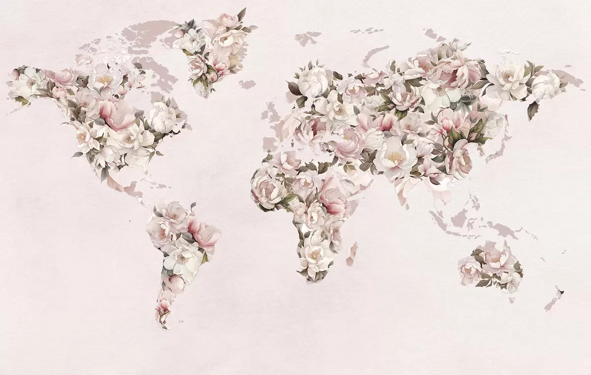 Fototapety Ružová mapa sveta vytvorená z veľkých bielych a ružových pivoniek Nr. c00005