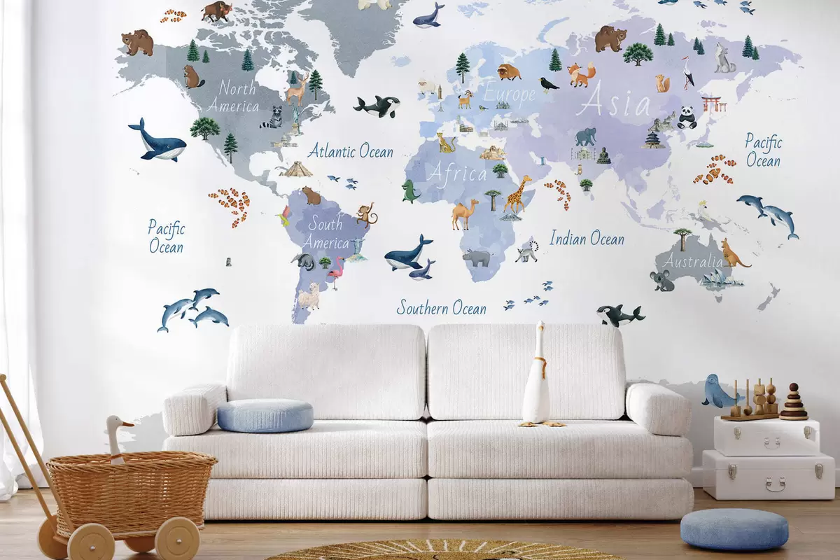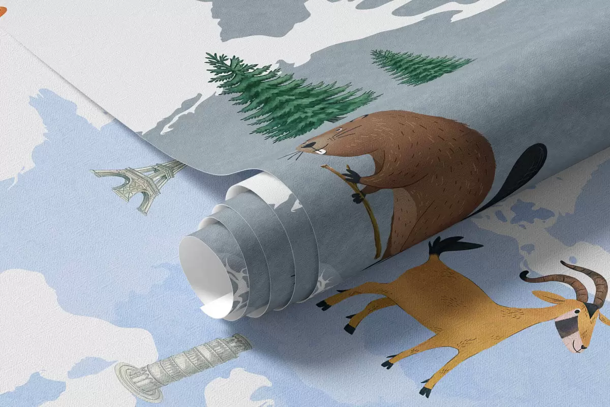 Fototapety Modrá mapa v akvarelovom štýle s motívmi zvierat, rastlín a architektúry. Popisky v angličtine Nr. c00009env1