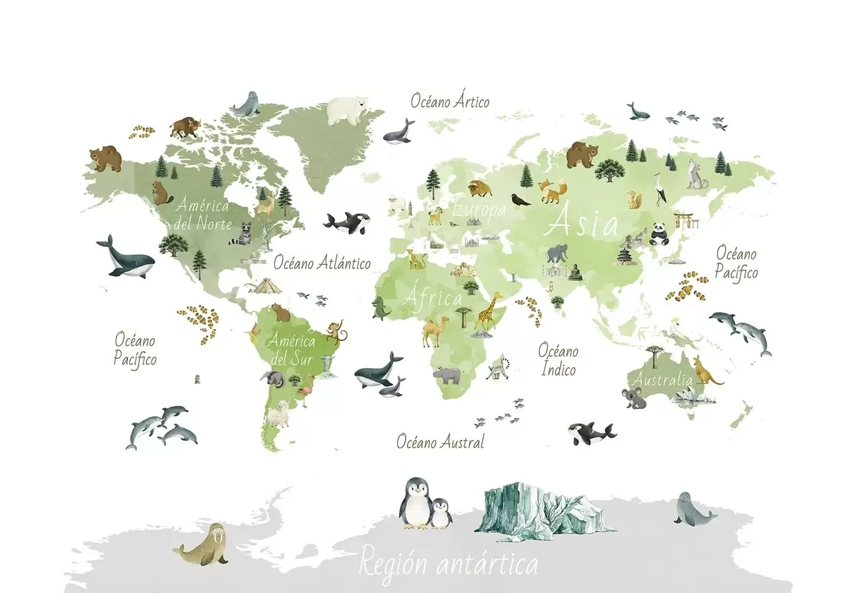 Fototapety Zelená mapa v akvarelovom štýle s motívmi zvierat, rastlín a architektúry. Popisky v španielčine Nr. c00009esv2