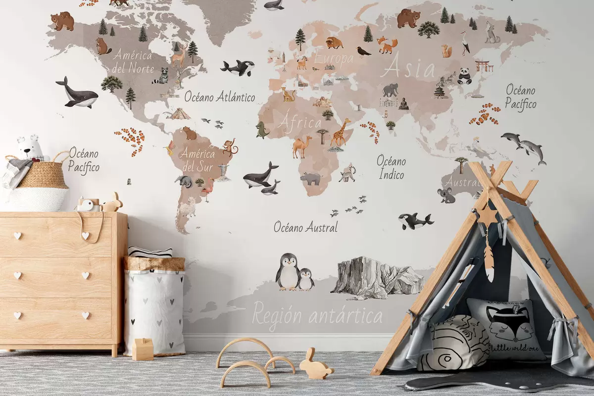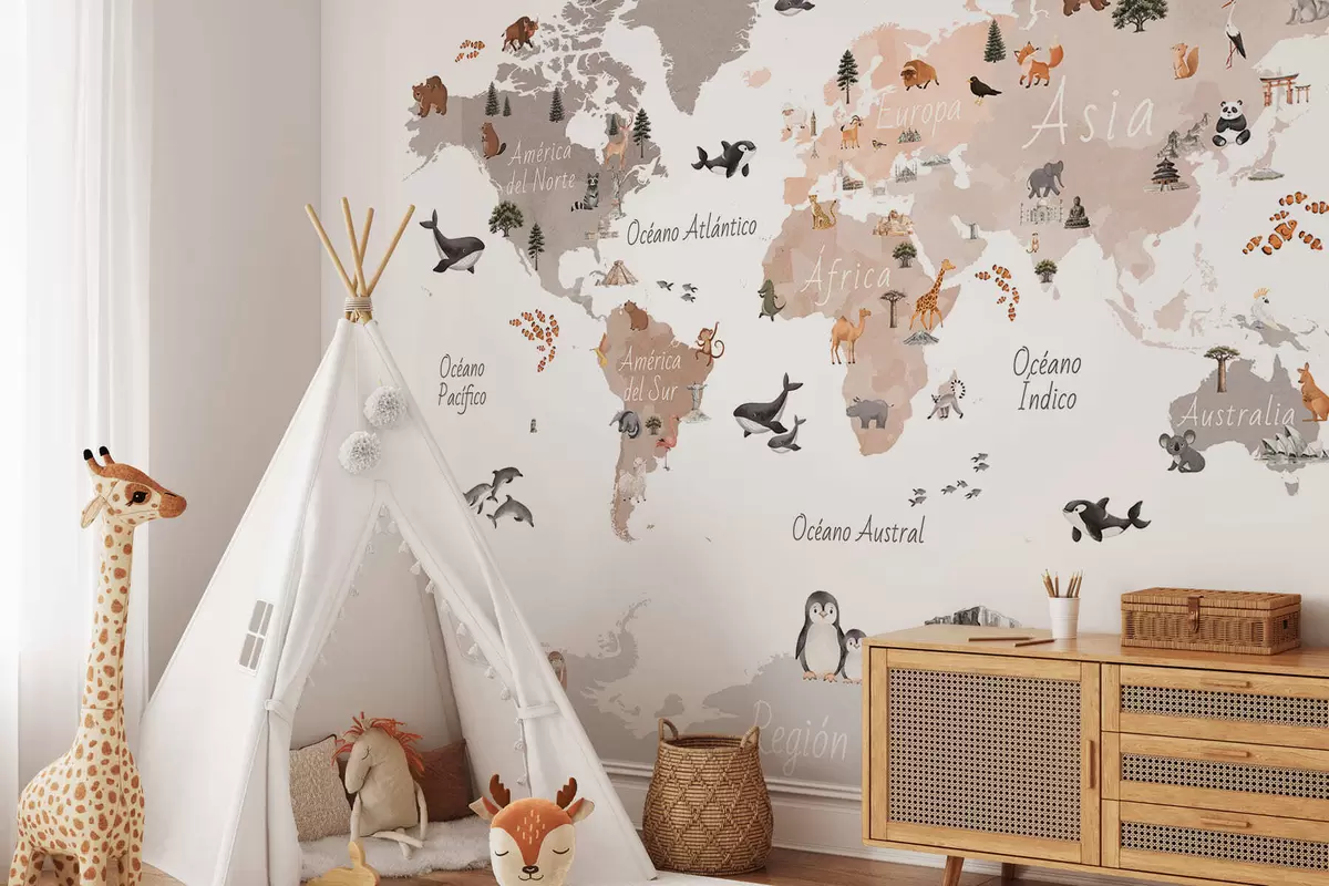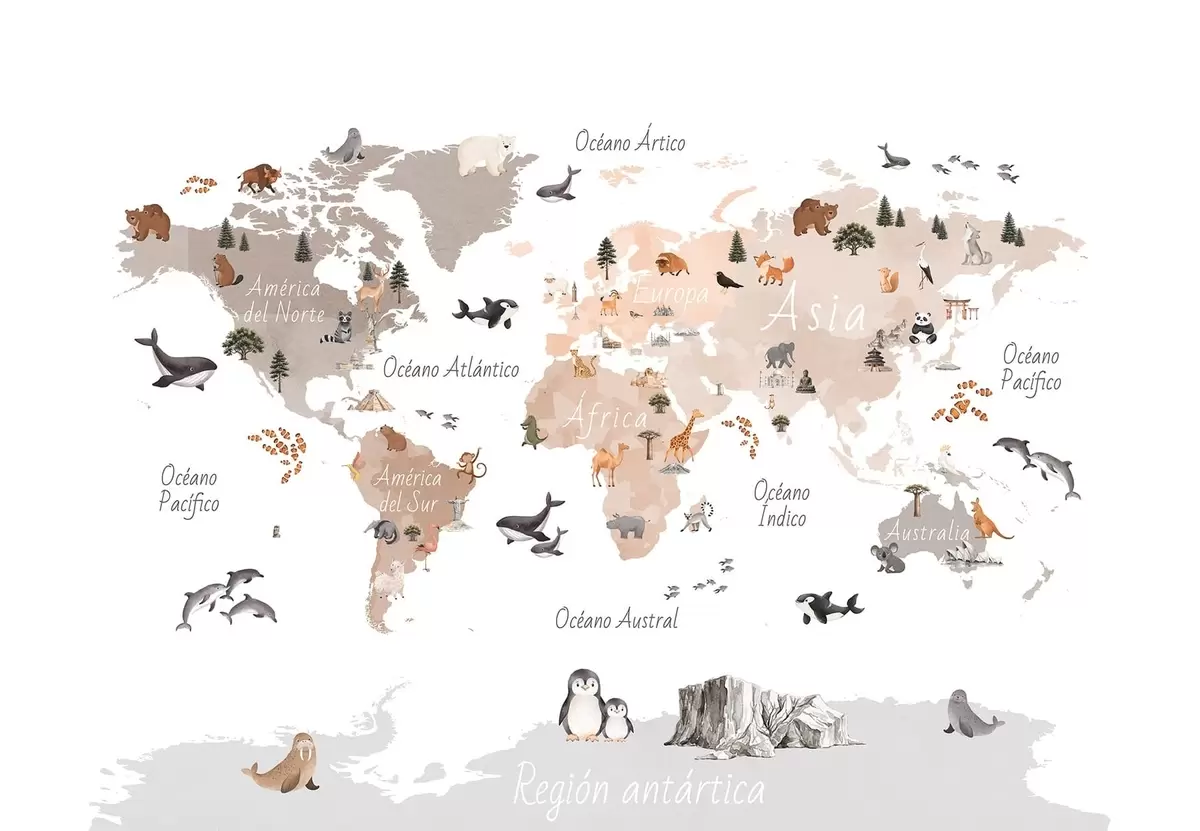 Fototapety Mapa v béžových odtieňoch v štýle akvarelu, na ktorej sú zobrazené zvieratá, rastliny a architektúra. Názvy v španielčine Nr. c00009esv3