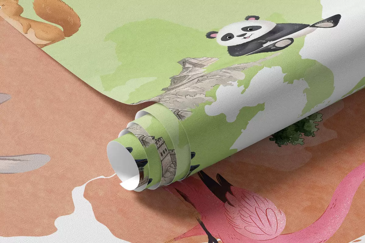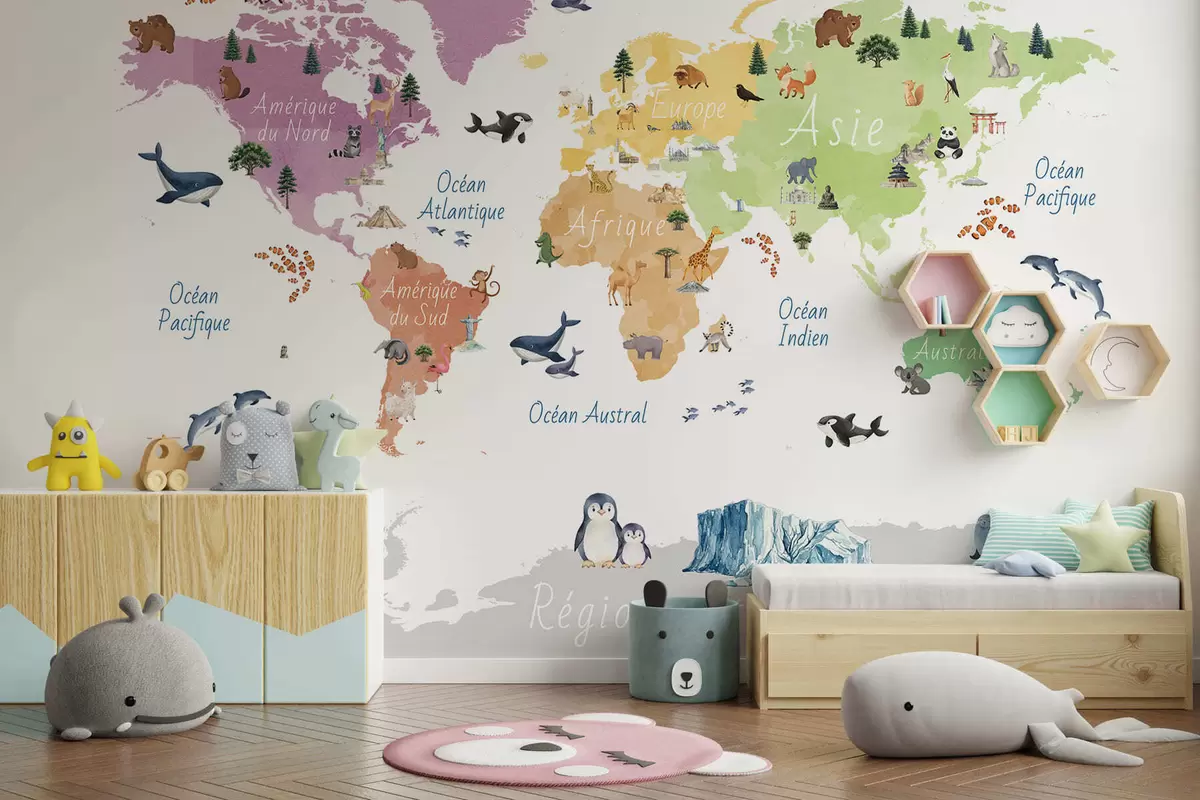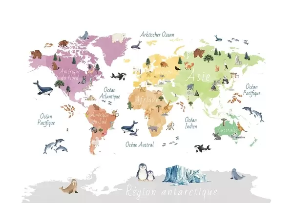 Fototapety Farebná mapa v akvarelovom štýle s vyobrazeniami zvierat, rastlín a architektúry. Popisky vo francúzštine Nr. c00009fr