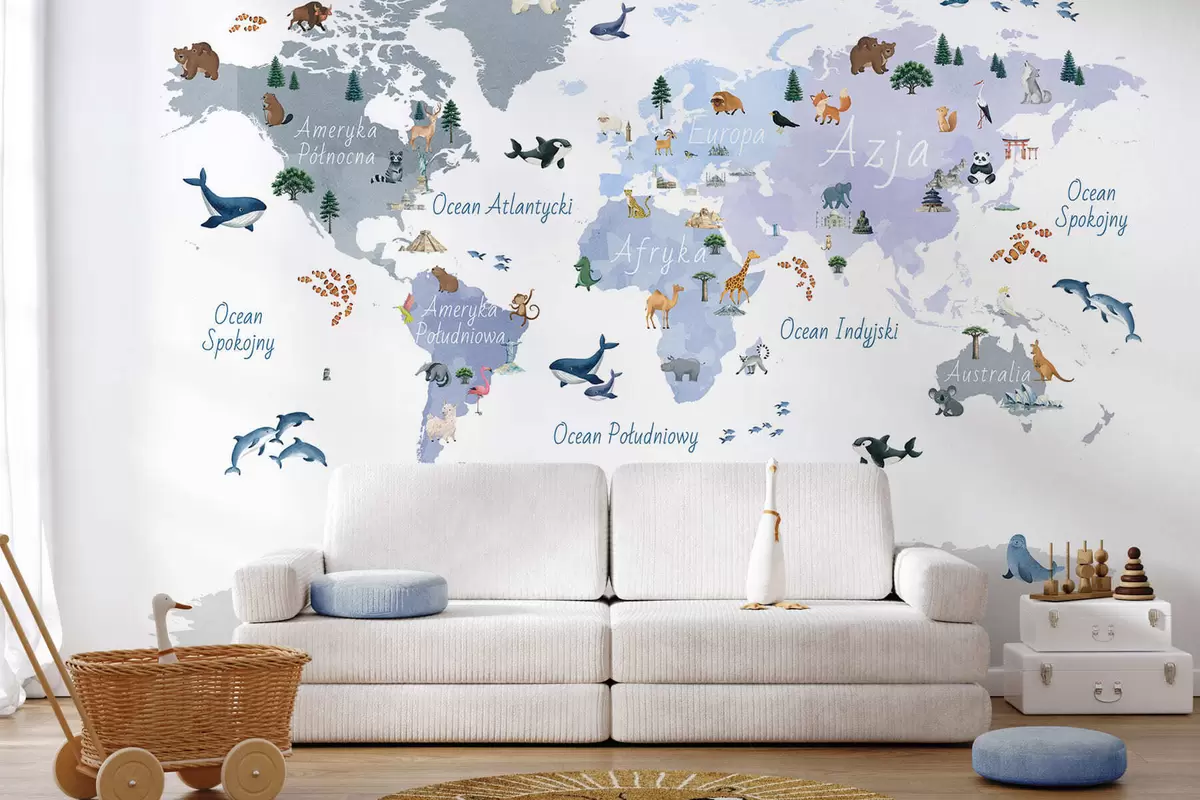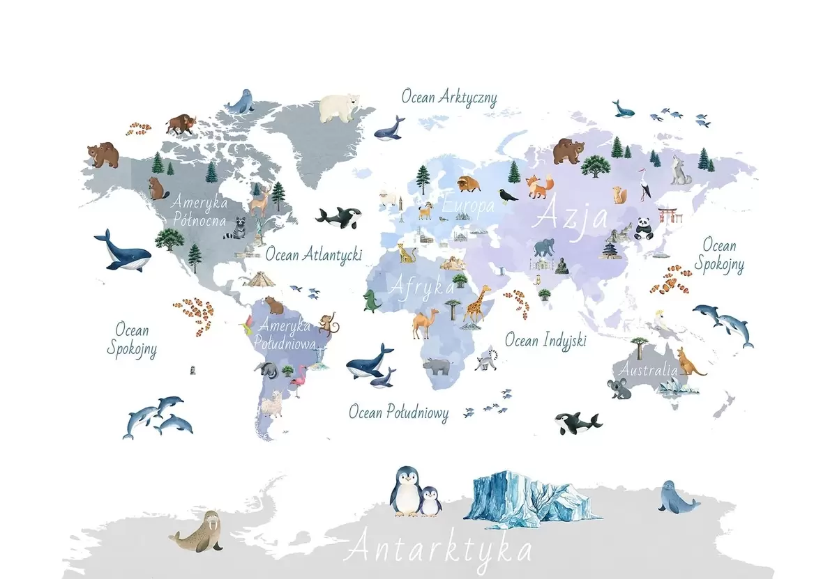 Fototapety Modrá mapa v akvarelovom štýle s motívmi zvierat, rastlín a architektúry. Popisky v poľštine Nr. c00009plv1