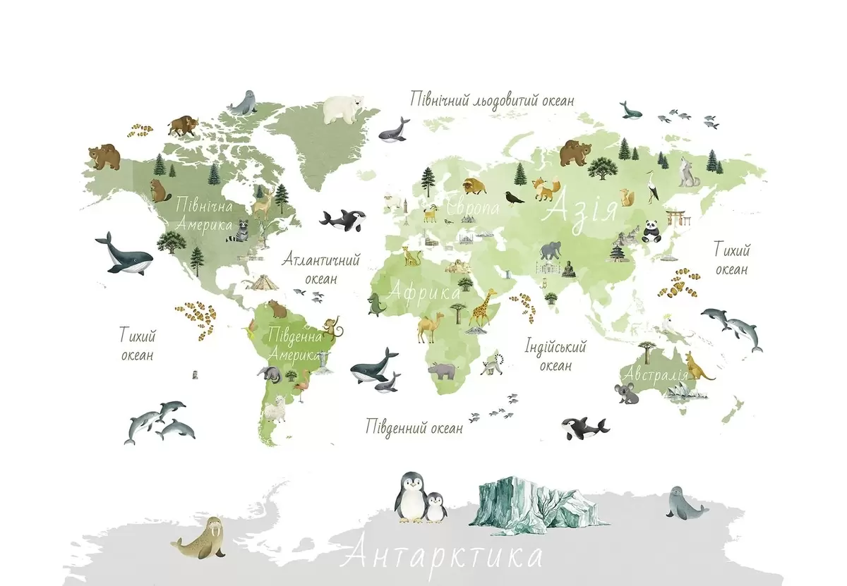 Fototapety Zelená mapa v akvarelovom štýle s motívmi zvierat, rastlín a architektúry. Popisky v ukrajinčine Nr. c00009ukv2