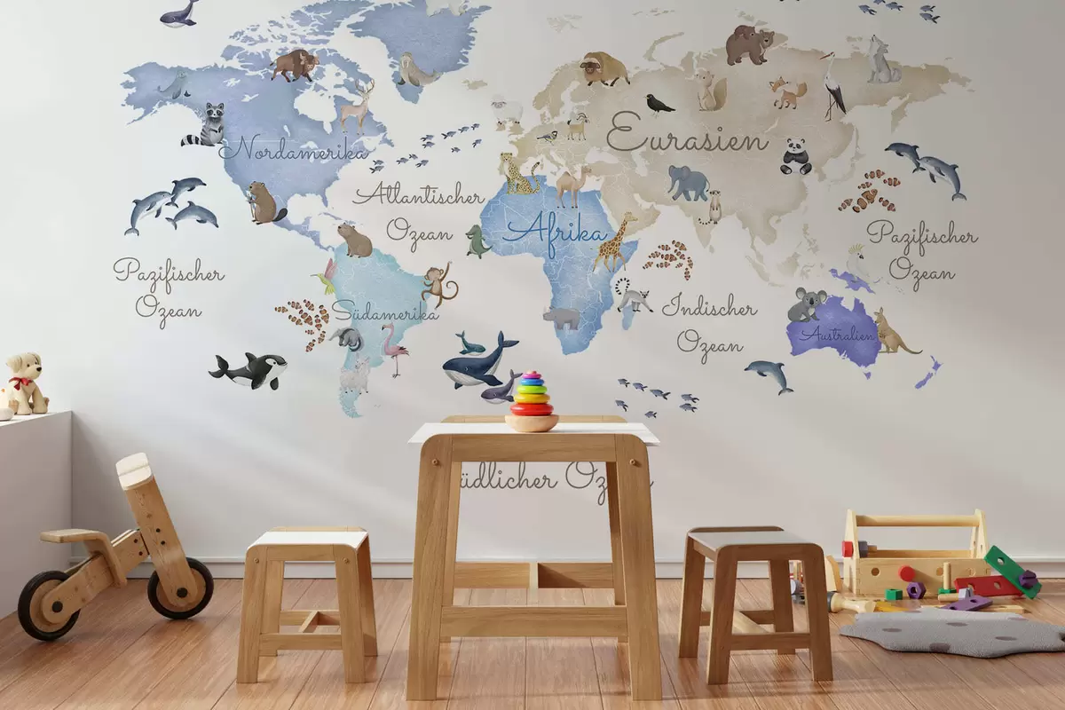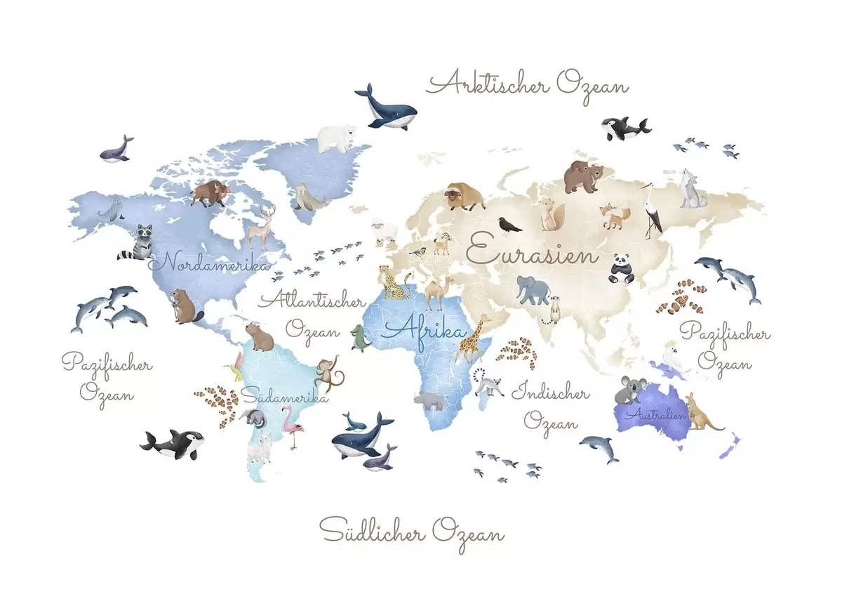 Fototapety Modrá mapa v akvarelovom štýle so zvieratami. Názvy v nemčine Nr. c00012dev1