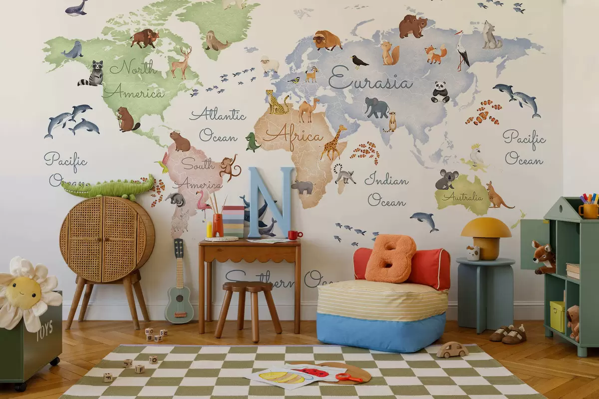Fototapety Farebná mapa v akvarelovom štýle so zvieratami. Názvy v angličtine Nr. c00012en