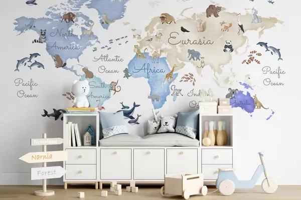 Fototapety Modrá mapa v akvarelovom štýle so zvieratami. Názvy v angličtine Nr. c00012env1