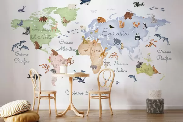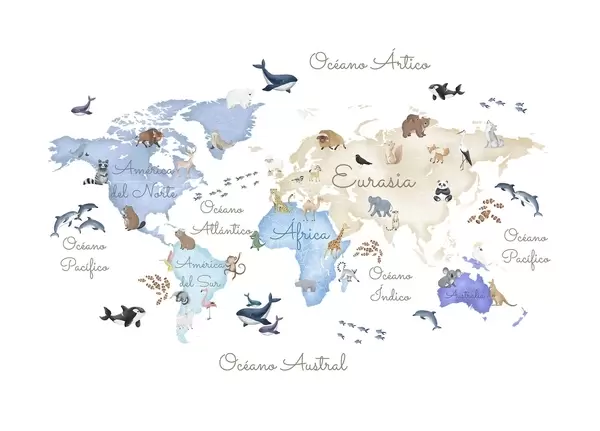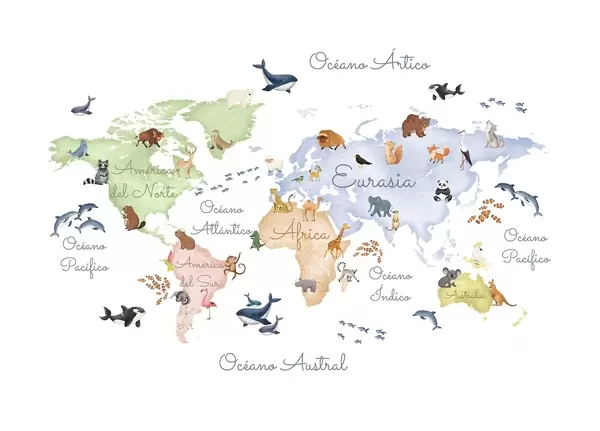 Fototapety Farebná mapa v akvarelovom štýle so zvieratami. Názvy v španielčine Nr. c00012es