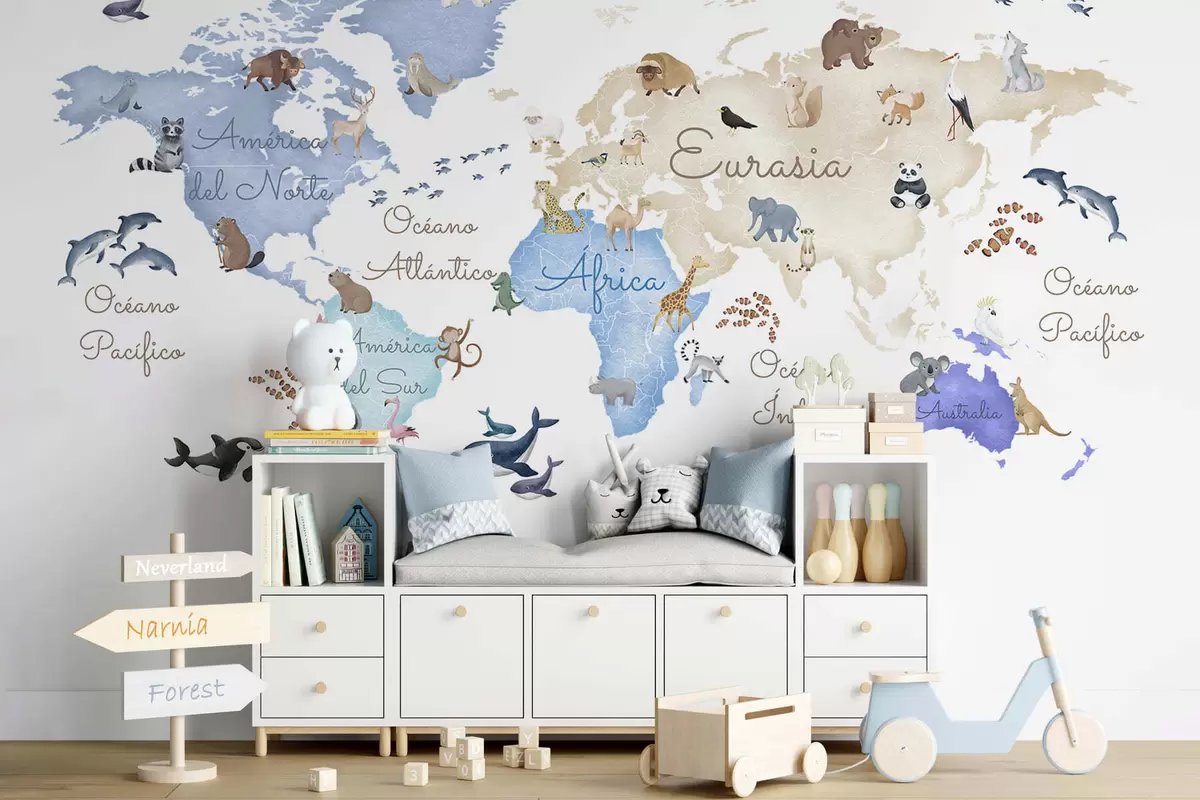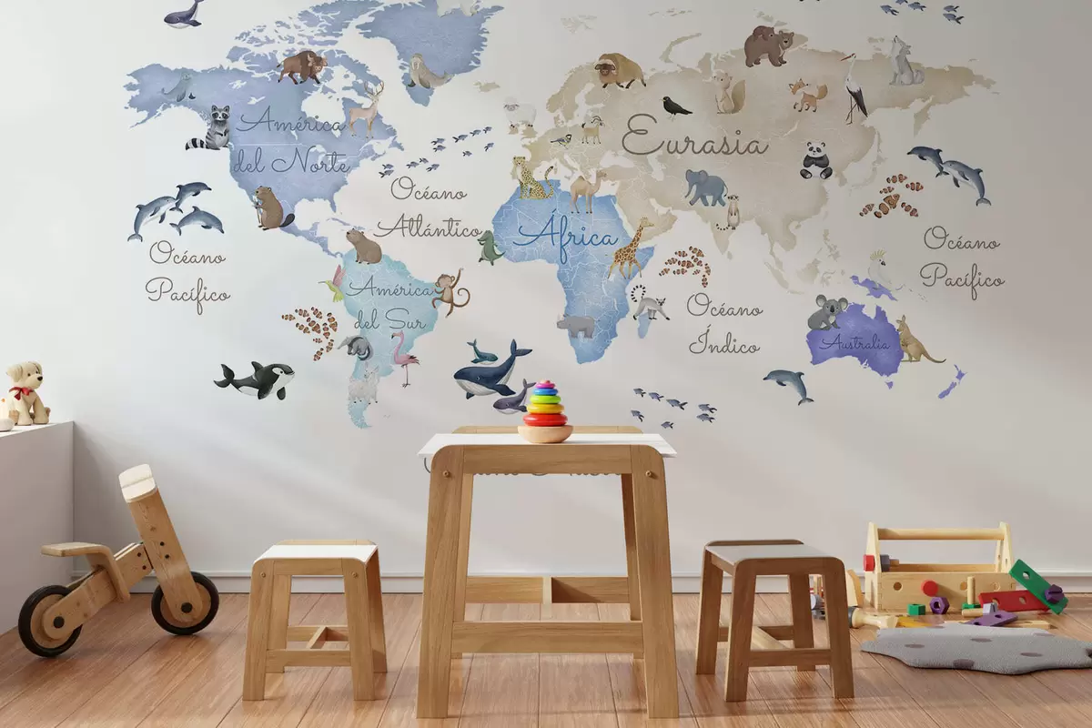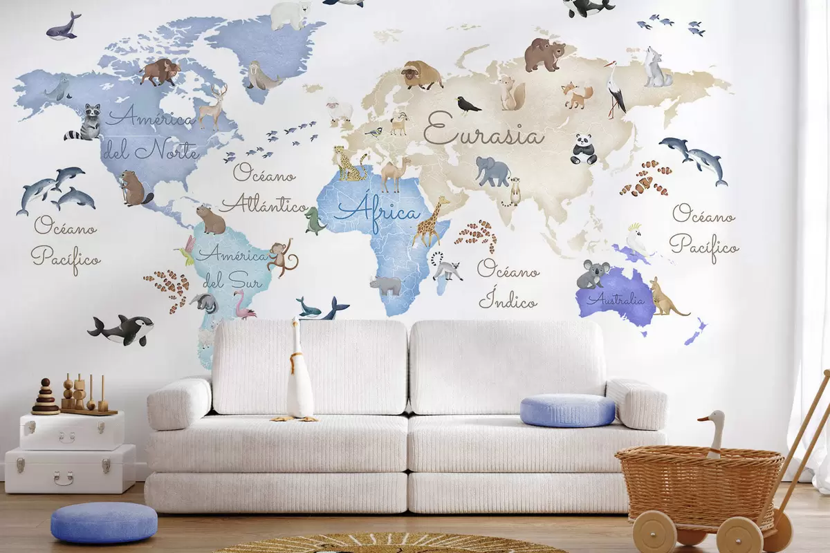 Fototapety Modrá mapa v akvarelovom štýle so zvieratami. Názvy v španielčine Nr. c00012esv1
