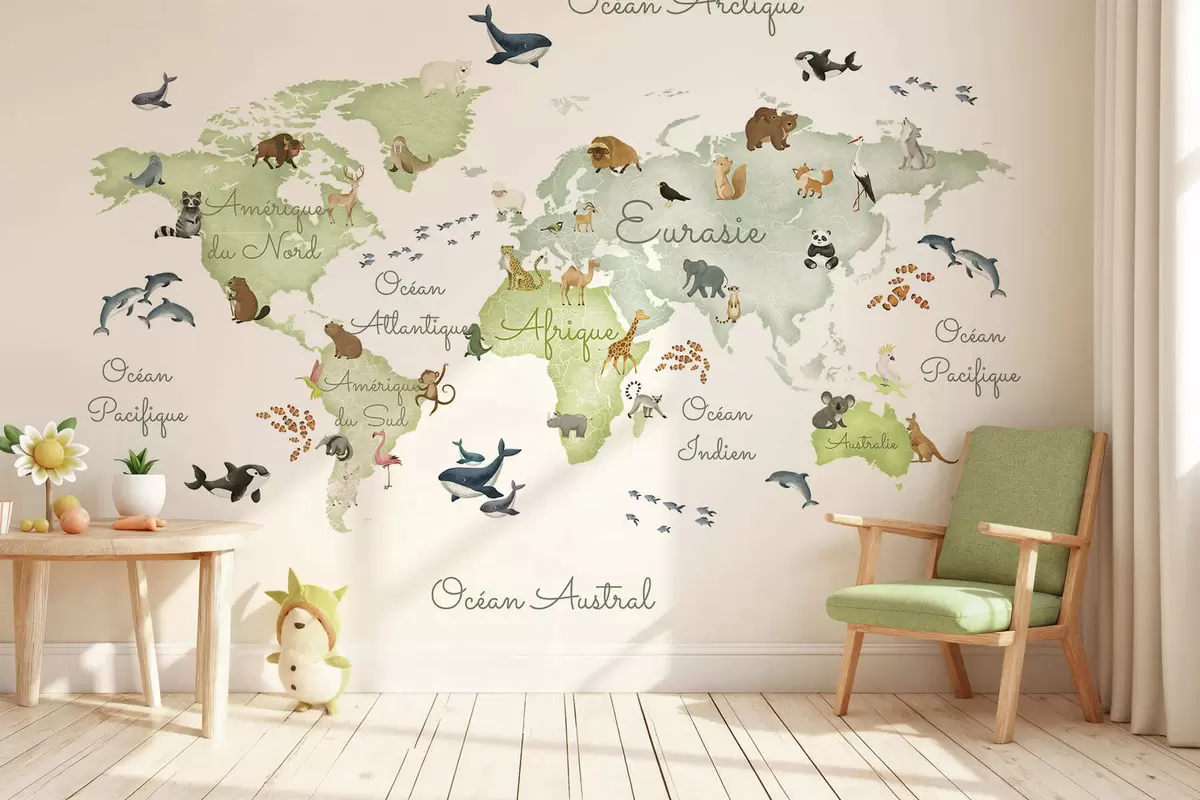 Fototapety Zelená mapa v akvarelovom štýle so zvieratami. Názvy v francúzštine Nr. c00012frv2