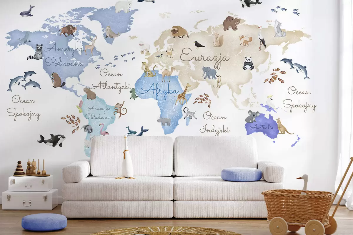 Fototapety Modrá mapa v akvarelovom štýle so zvieratami. Názvy v poľštine Nr. c00012plv1