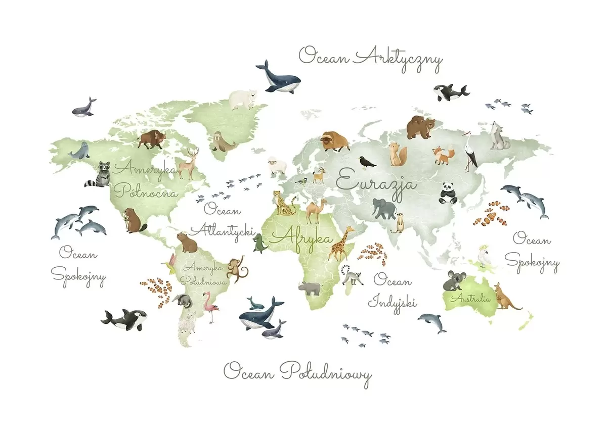 Fototapety Zelená mapa v akvarelovom štýle so zvieratami. Názvy v poľštine Nr. c00012plv2