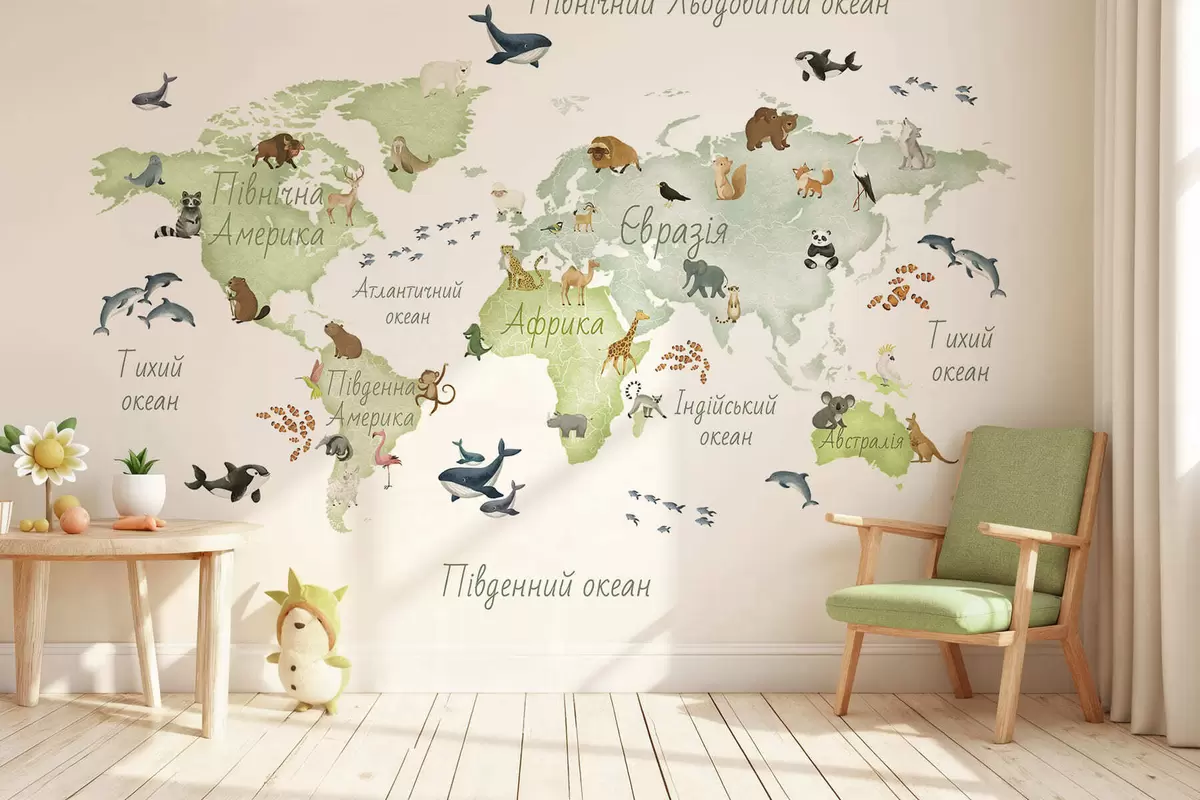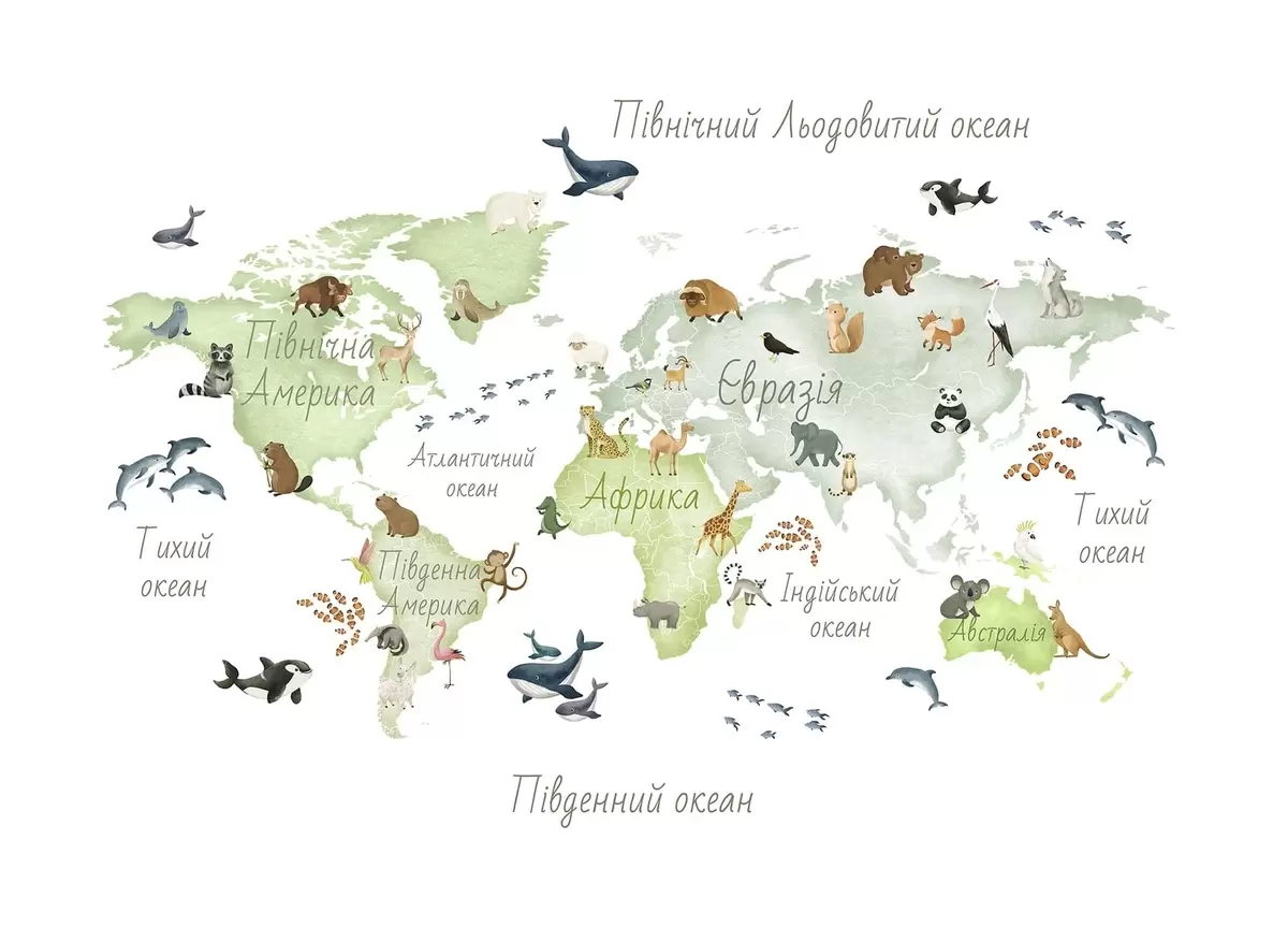 Fototapety Zelená mapa v akvarelovom štýle so zvieratami. Názvy v ukrajinčine Nr. c00012ukv2