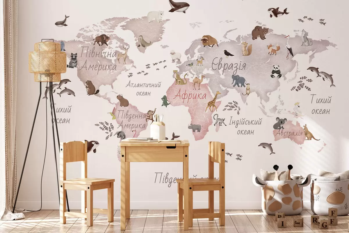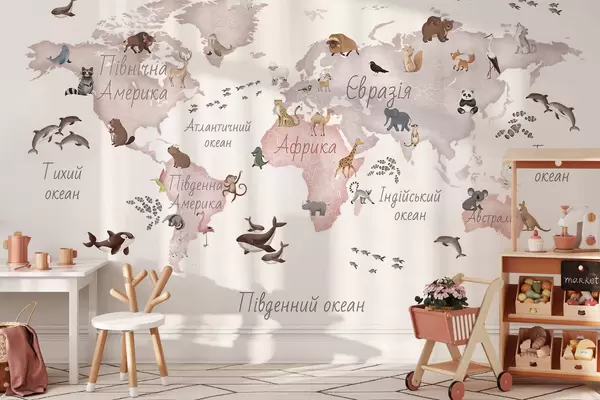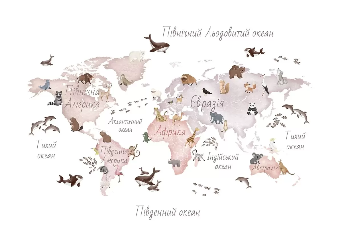 Fototapety Mapa v béžových farbách v štýle akvarelu so zvieratami. Názvy v ukrajinčine Nr. c00012ukv3