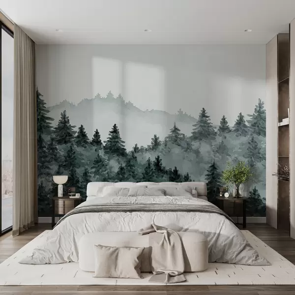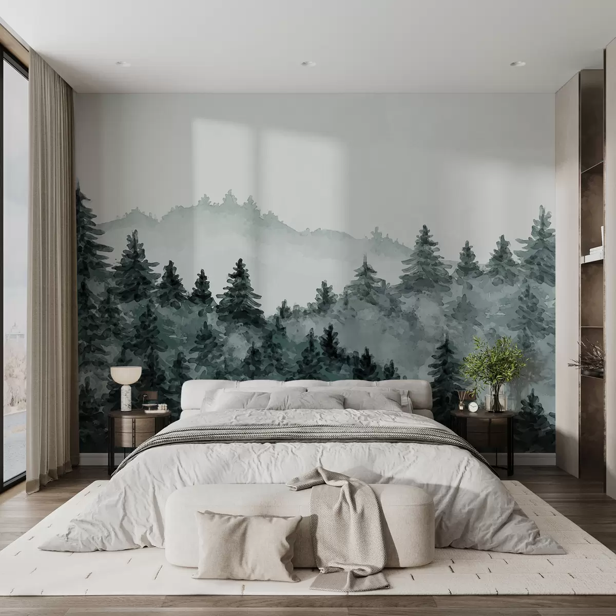 Fototapety Akvarel lesná krajina, hmla, zelená farba, borovice Nr. u98994