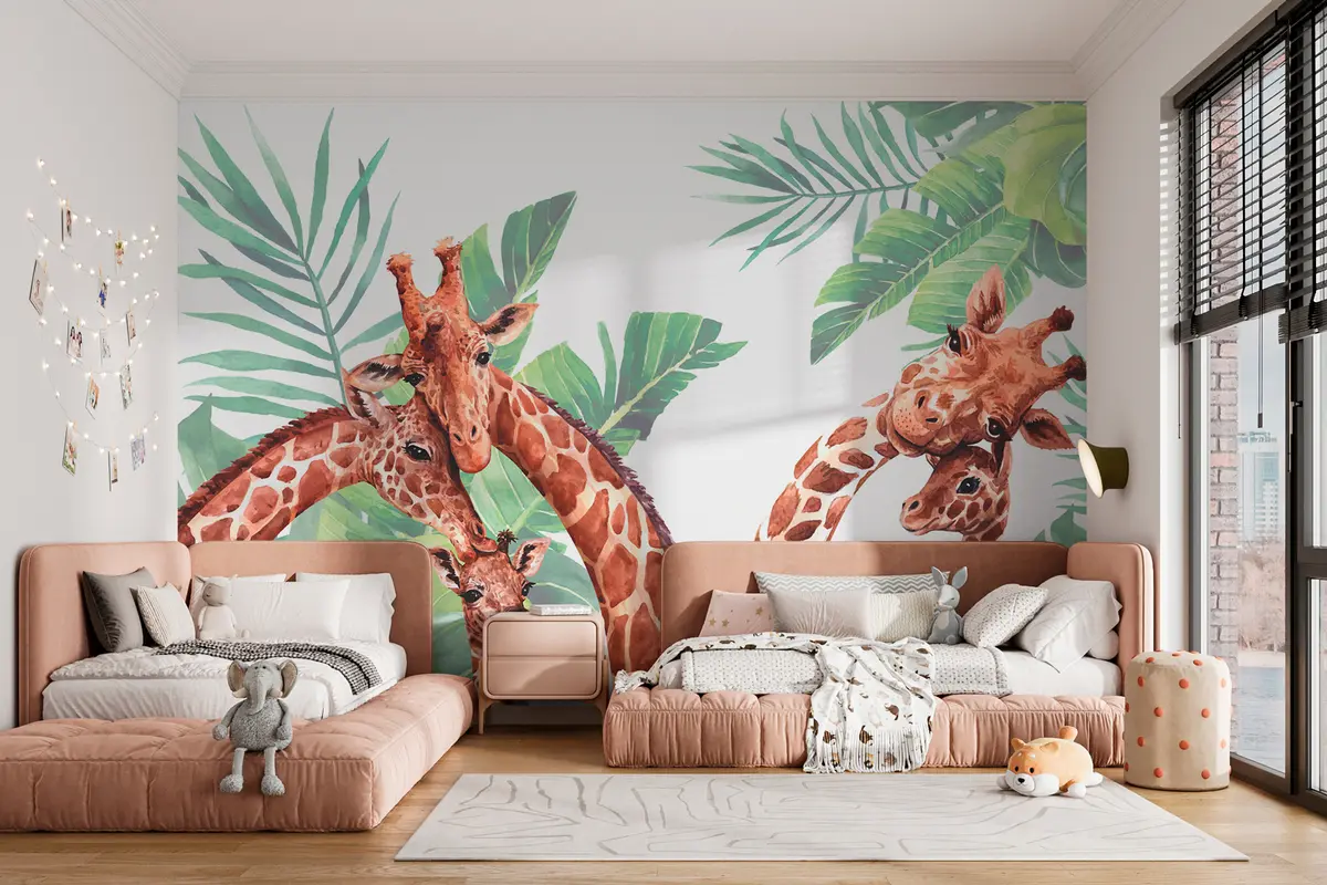 Fototapety Kreslená žirafia rodinka a palmové listy na bielom pozadí Nr. w00140v3