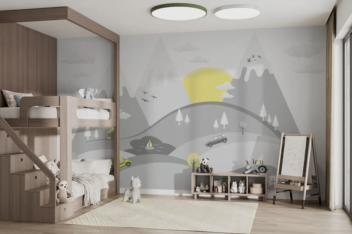 Fototapety Hory, slnko a autá do detskej izby Nr. w00219